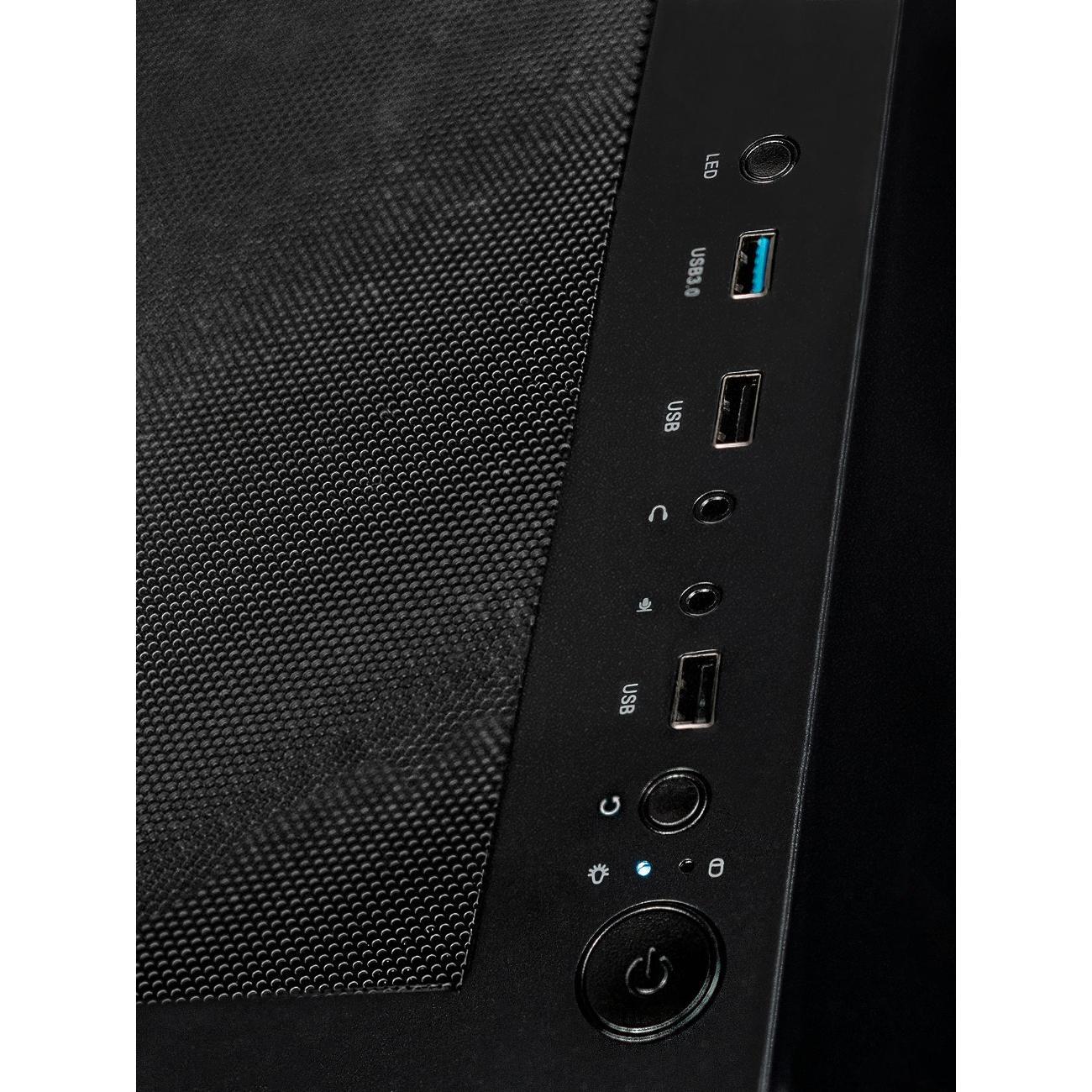 Пиковая мощность блока питания — 600 Вт. Корпус хорошо продувается, что предотвращает перегрев компонентов. Встроенная RGB-подсветка эффектно выглядит, при желании ее можно отключить. Габаритные размеры: 45х20х44 см, вес — 8 кг.