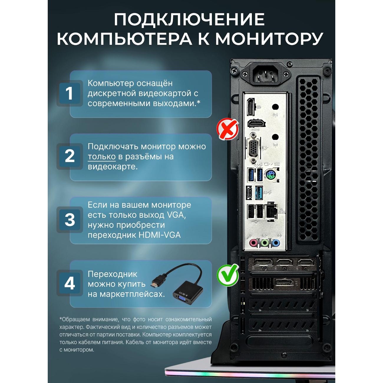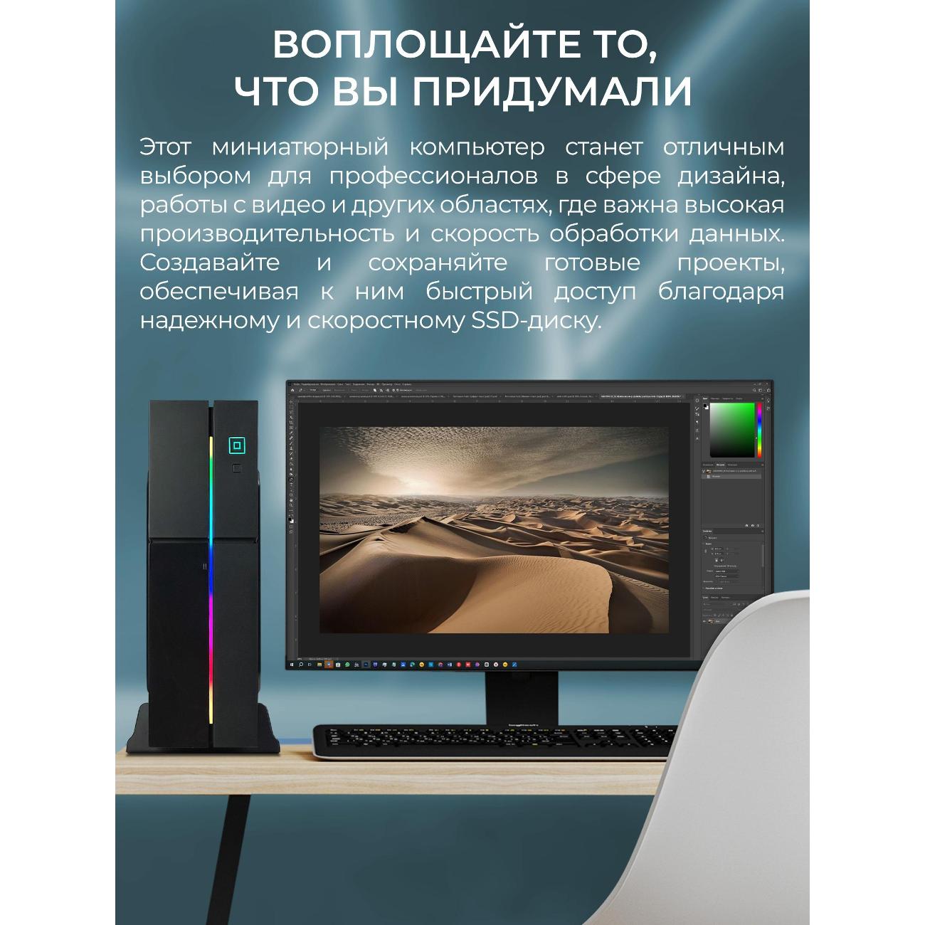Системный блок мини Robotcomp «Колибри» Rgb с четырехъядерным процессором оснащен двумя слотами оперативной памяти типа DDR4 размером 16 ГБ и частотой 3200 МГц. Охлаждение — воздушное. Операционная система — Windows 10 Pro 64. Страна-производитель — Россия. Видеокарта — GeForce RTX 3050 8GB. Объем SSD — 960 ГБ. Максимальная мощность блока питания составляет 400 Вт. Предусмотрены интерфейсы USB 2.0 и 3.0, DisplayPort, HDMI, LAN, 3,5 мм. Передача данных происходит при поддержке Gigabit LAN. Цвет корпуса — черный. Вес — 8 кг. Габариты — 30х12х42 см.