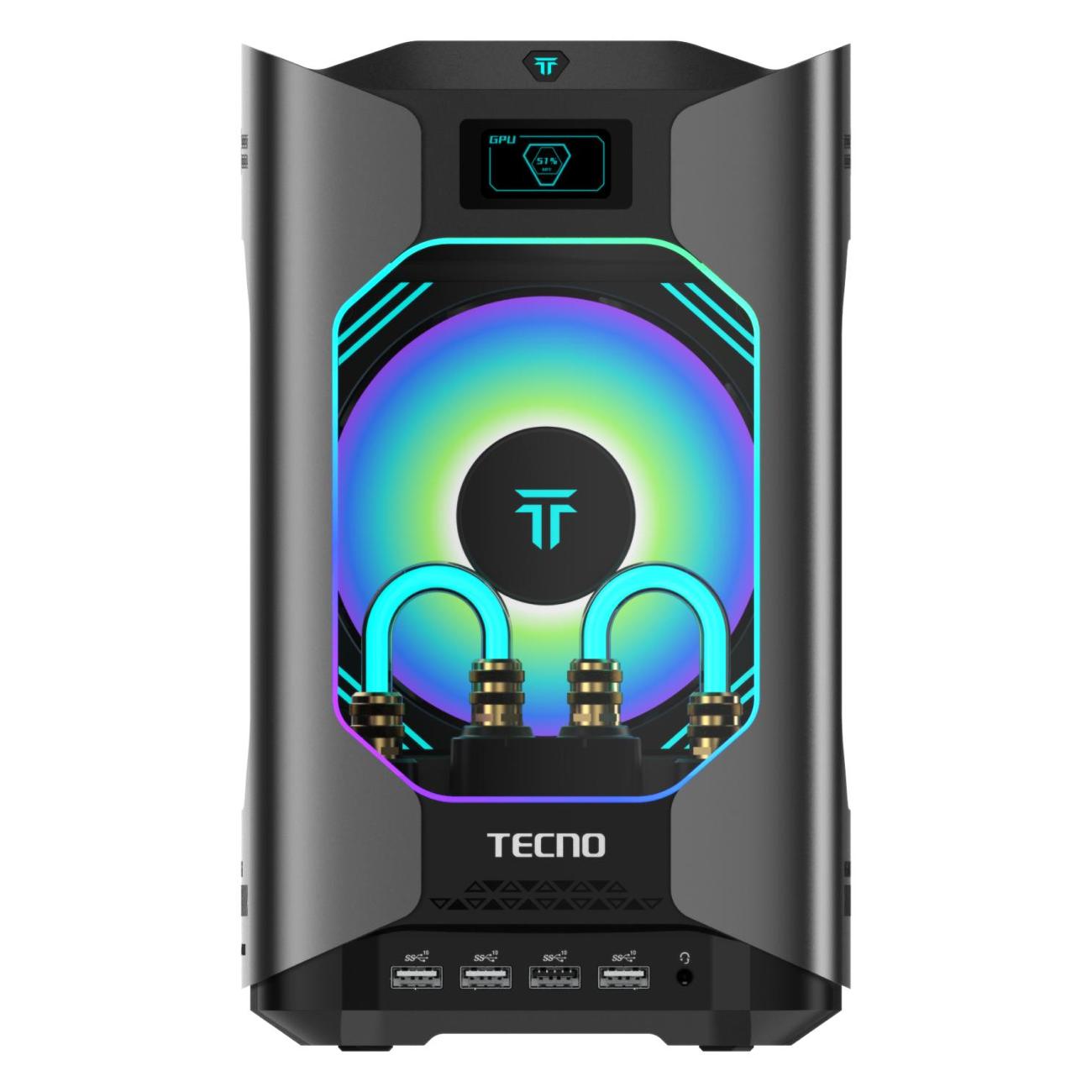 Обладает габаритами 26х15,5х15,5 см и весом 3,5 кг, снабжен прозрачными панелями и RGB-подсветкой. Встроенный дисплей отображает параметры нагрузки и температуру центрального процессора, видеокарты и оперативной памяти — позволяет точно контролировать состояние системы.