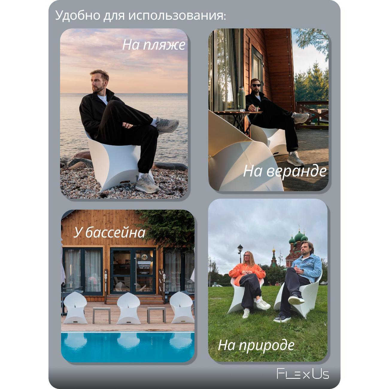 Складное дизайнерское кресло FlexUs — стильное и практичное решение для дома, дачи и отдыха. Всего за несколько секунд оно превращается из компактного конверта толщиной всего 1,5 см в удобное полноценное кресло. Его удобно хранить, брать с собой в поездки или перевозить в багажнике автомобиля, а удобная ручка позволяет переносить кресло одной рукой. Кресло выполнено из специального приятного на ощупь пластика, который не боится воды и солнечных лучей, легко очищается и выдерживает нагрузку до 160 кг. Благодаря продуманной конструкции внешняя сторона в сложенном виде становится внутренней при сборке — даже случайные царапины не будут видны. FlexUs гармонично впишется в интерьер квартиры, лоджии, частного дома или веранды и станет отличным спутником для отдыха на природе, пикников и путешествий. Футуристичный дизайн, компактность и надежность делают кресло FlexUs идеальным выбором для тех, кто ценит комфорт и функциональность.