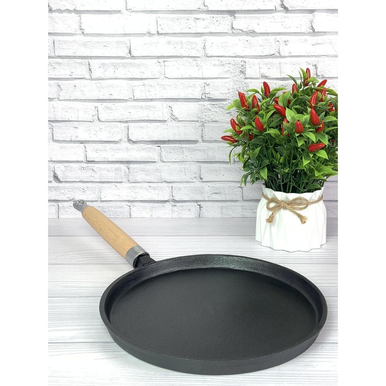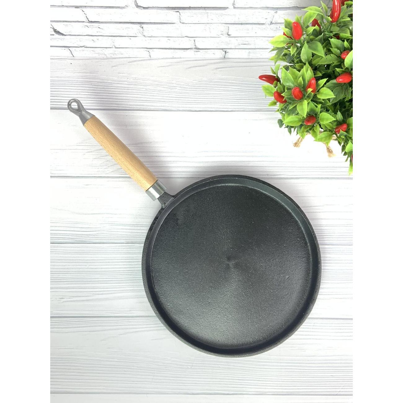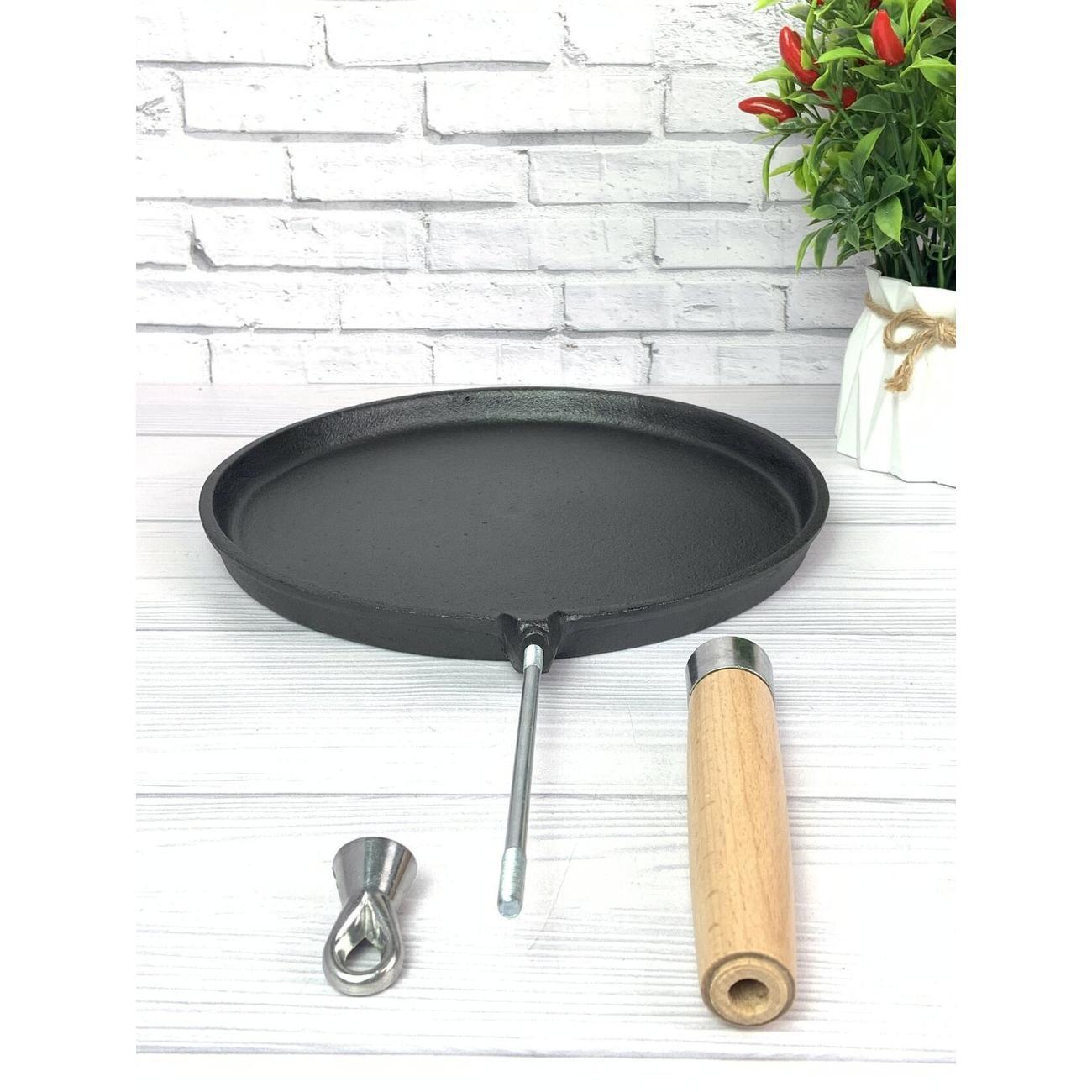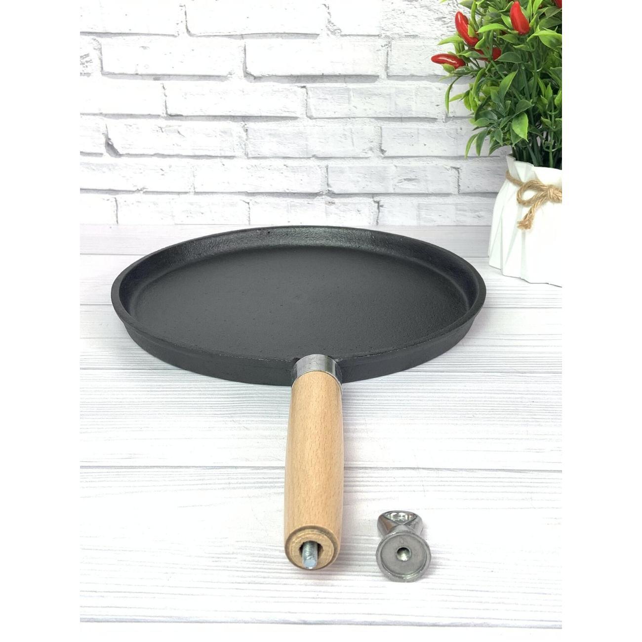Сковорода блинная чугунная для приготовления блинов и оладий 24 см для всех видов плит, включая индукционную со съемной деревянной ручкой.
