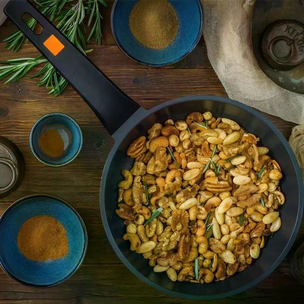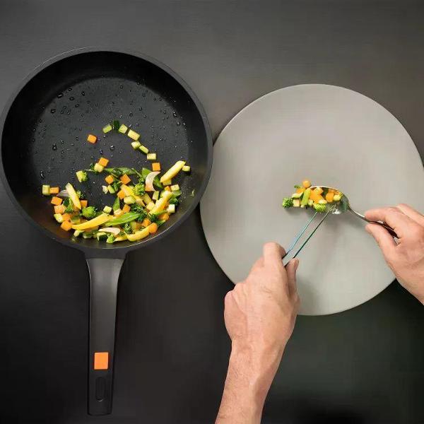 Ручка произведена из термостойкого материала, имеет эргономичную форму, что позволяет легко штабелировать сковородки при хранении