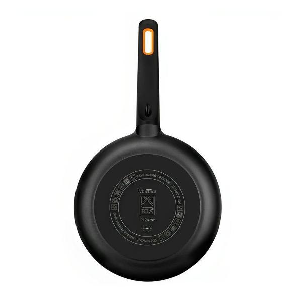 Ручка произведена из термостойкого материала, имеет эргономичную форму, что позволяет легко штабелировать сковородки при хранении