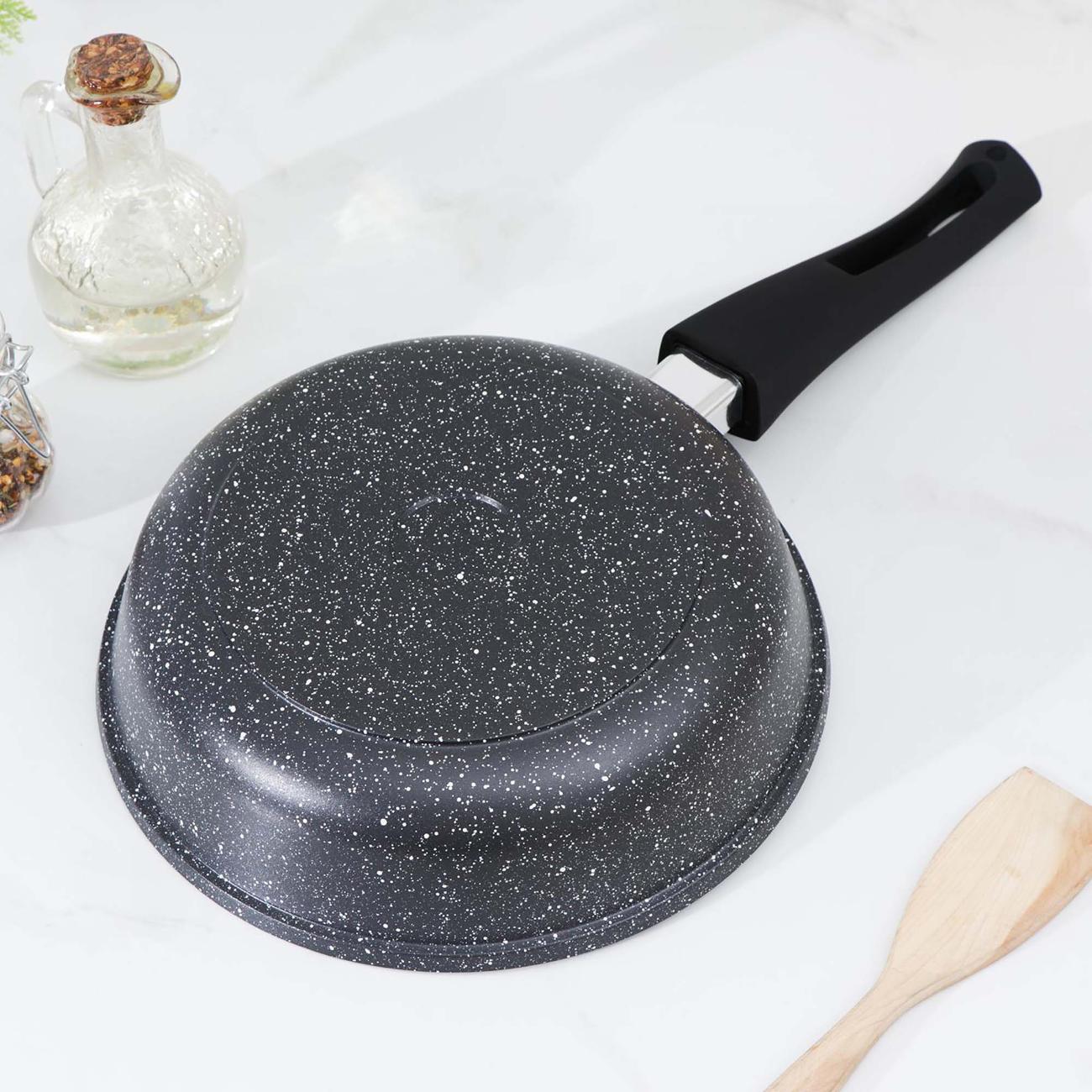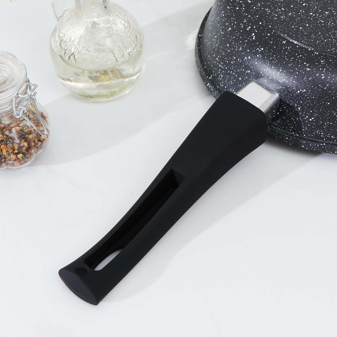 Сковорода «Доляна» «Элит» 2486330 подходит для мытья в посудомоечной машине. Для удаления загрязнений вручную рекомендуется использовать мягкие губки, чтобы не повредить поверхность. В рабочей области нанесено антипригарное покрытие, поэтому блюда можно готовить без добавления масла.