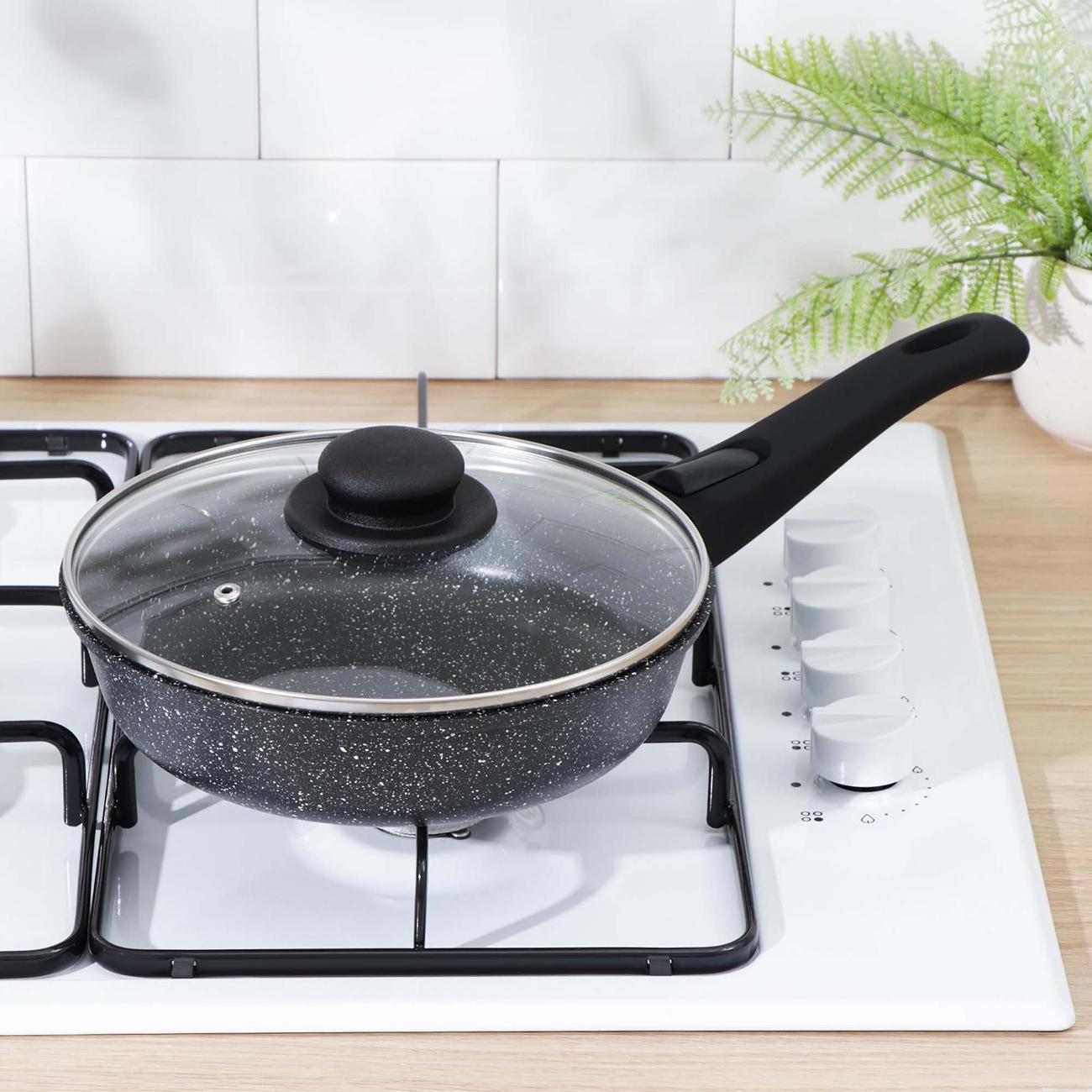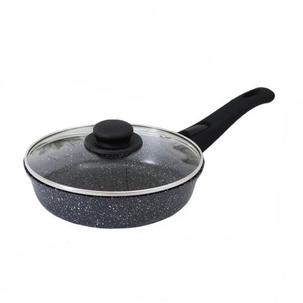 Корпус посуды выполнен из алюминия, который не деформируется при частом воздействии высоких температур. Пластиковая ручка не нагревается в процессе готовки. Есть петля для подвешивания. Диаметр сковороды составляет 22 см. Вес — 1,4 кг. Предназначена для нагрева на газовых, электрических, стеклокерамических плитах. В комплекте идет крышка из жаропрочного стекла.