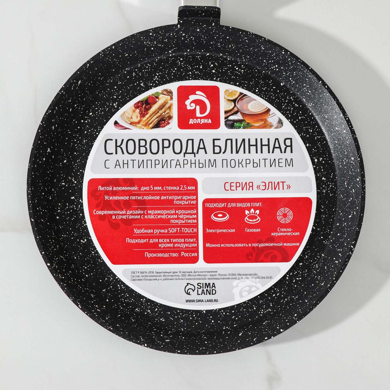 Сковорода «Доляна» «Элит» 2486332 подходит для мытья в посудомоечной машине. Для удаления загрязнений вручную рекомендуется использовать мягкие губки, чтобы не повредить поверхность. В рабочей области нанесено антипригарное покрытие, поэтому блюда можно готовить без добавления масла.