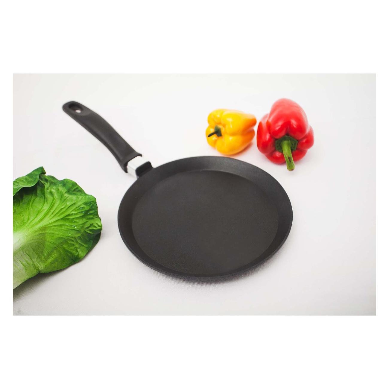 Корпус посуды выполнен из алюминия, который не деформируется при частом воздействии высоких температур. Пластиковая ручка не нагревается в процессе готовки. Есть петля для подвешивания. Диаметр сковороды составляет 22 см. Вес — 0,69 кг. Предназначена для нагрева на газовых, электрических, стеклокерамических плитах.