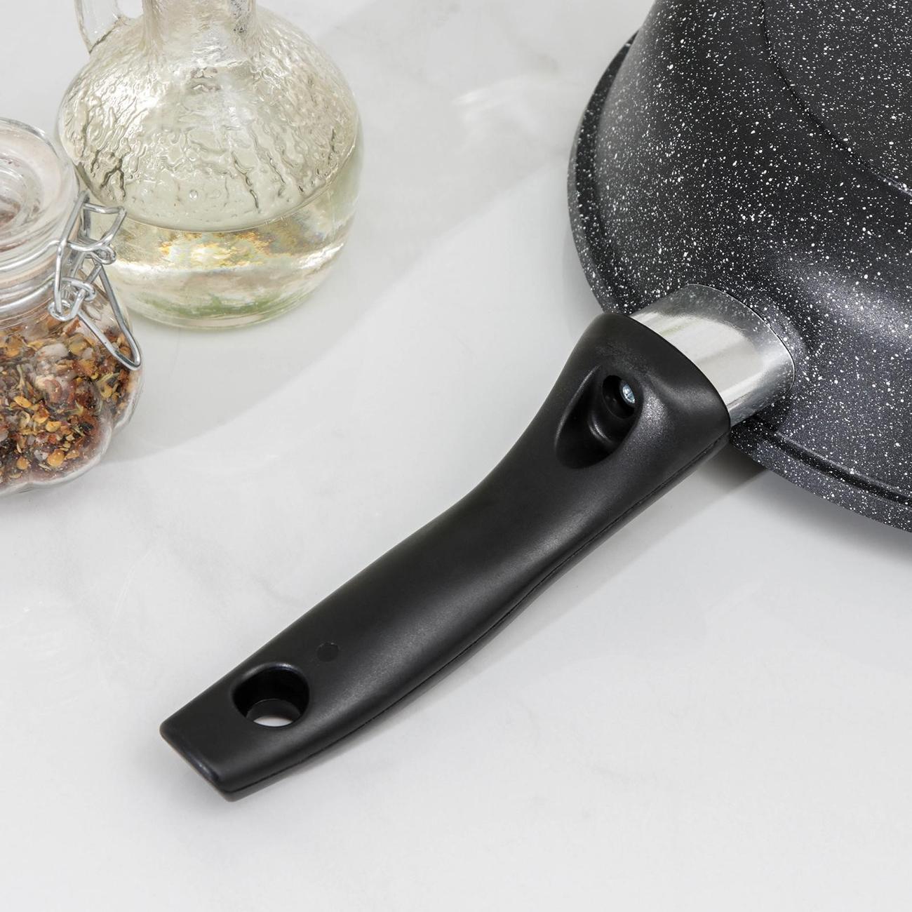 Сковорода «Доляна» «Элит» 6963987 подходит для мытья в посудомоечной машине. Для удаления загрязнений вручную рекомендуется использовать мягкие губки, чтобы не повредить поверхность. В рабочей области нанесено антипригарное покрытие, поэтому блюда можно готовить без добавления масла.