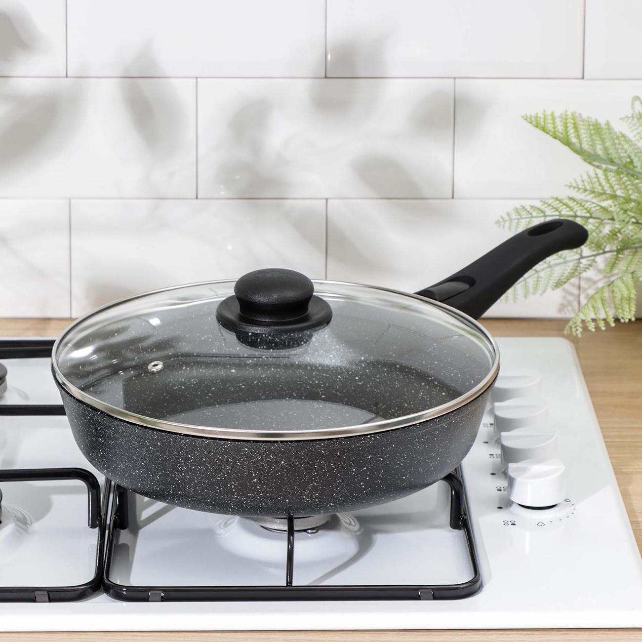 Корпус посуды выполнен из алюминия, который не деформируется при частом воздействии высоких температур. Пластиковая ручка не нагревается в процессе готовки. Есть петля для подвешивания. Диаметр сковороды составляет 28 см. Вес — 1,705 кг. Предназначена для нагрева на газовых, электрических, стеклокерамических плитах. В комплекте идет крышка из жаропрочного стекла.