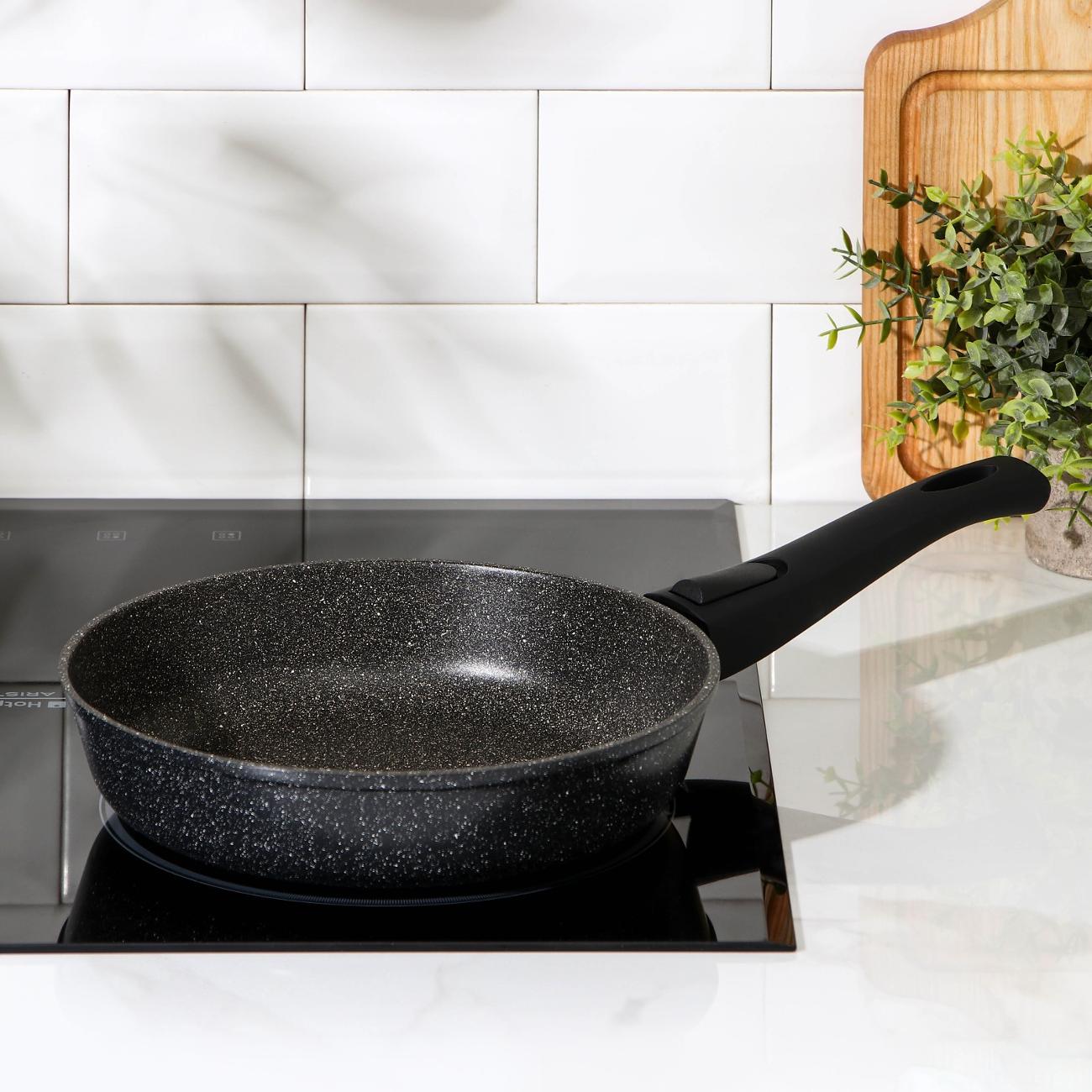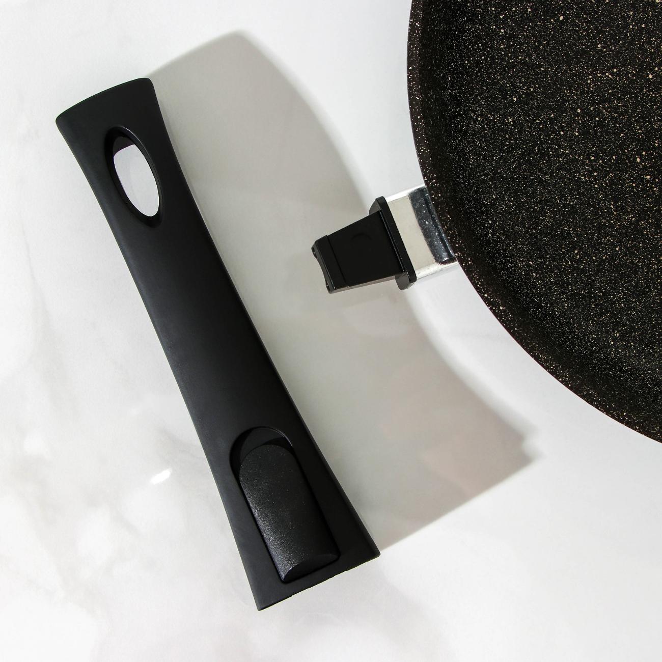 Сковорода «Доляна» «Элит» 7989245 диаметром 24 см оснащена съемной термоизолированной ручкой, экономящей место при хранении. Для изготовления корпуса используется литой алюминий. Прочный материал отличается быстрым нагревом, обеспечивая модели долговечность эксплуатации и равномерное распределение температуры. Пятислойное покрытие внутренней поверхности, в составе которого присутствуют минеральные частицы, обладает антипригарными свойствами. Неприхотливое в уходе изделие легко отмывается от загрязнений с помощью губки и в посудомоечной машине. Утолщенное дно подходит для всех разновидностей конфорок, кроме индукционных.