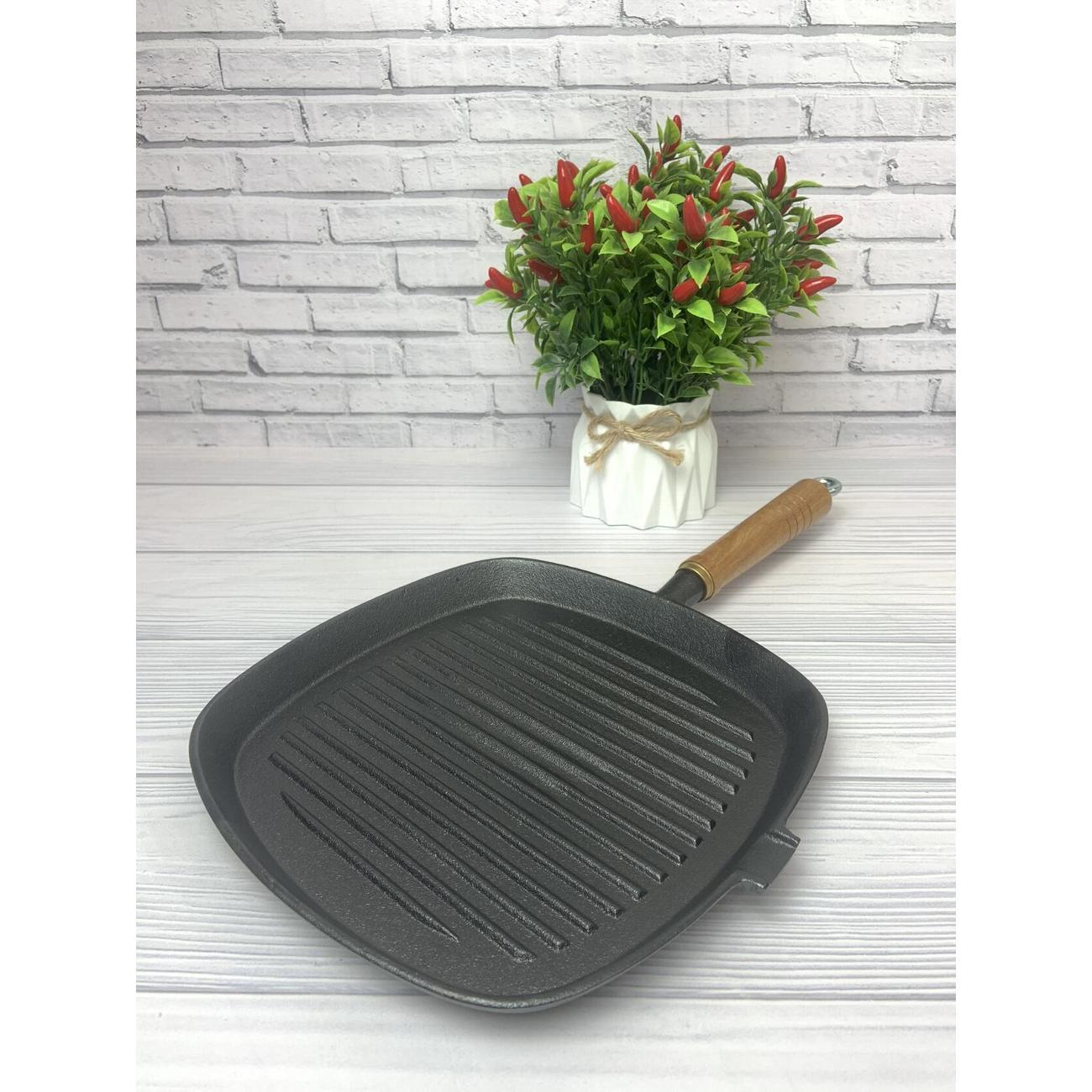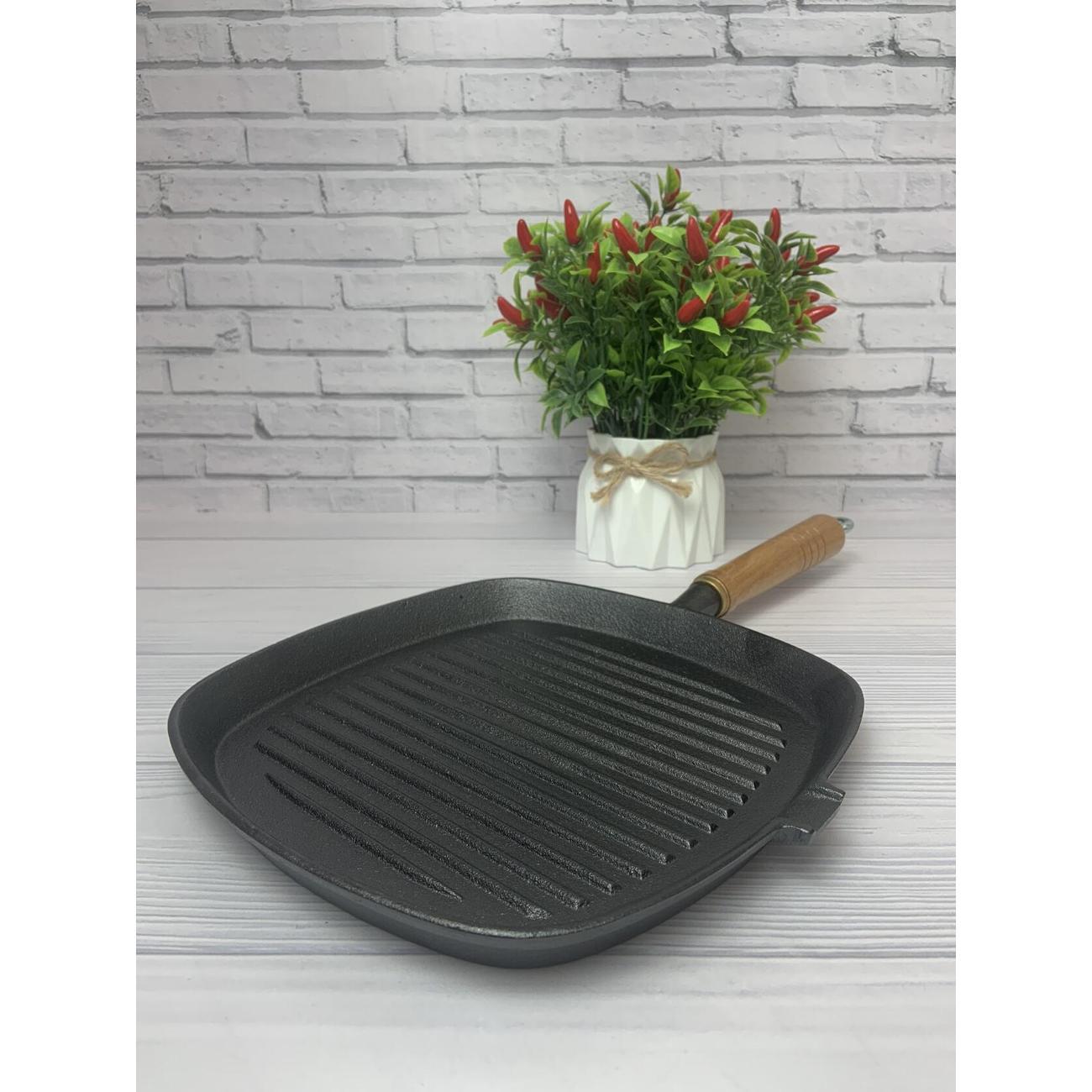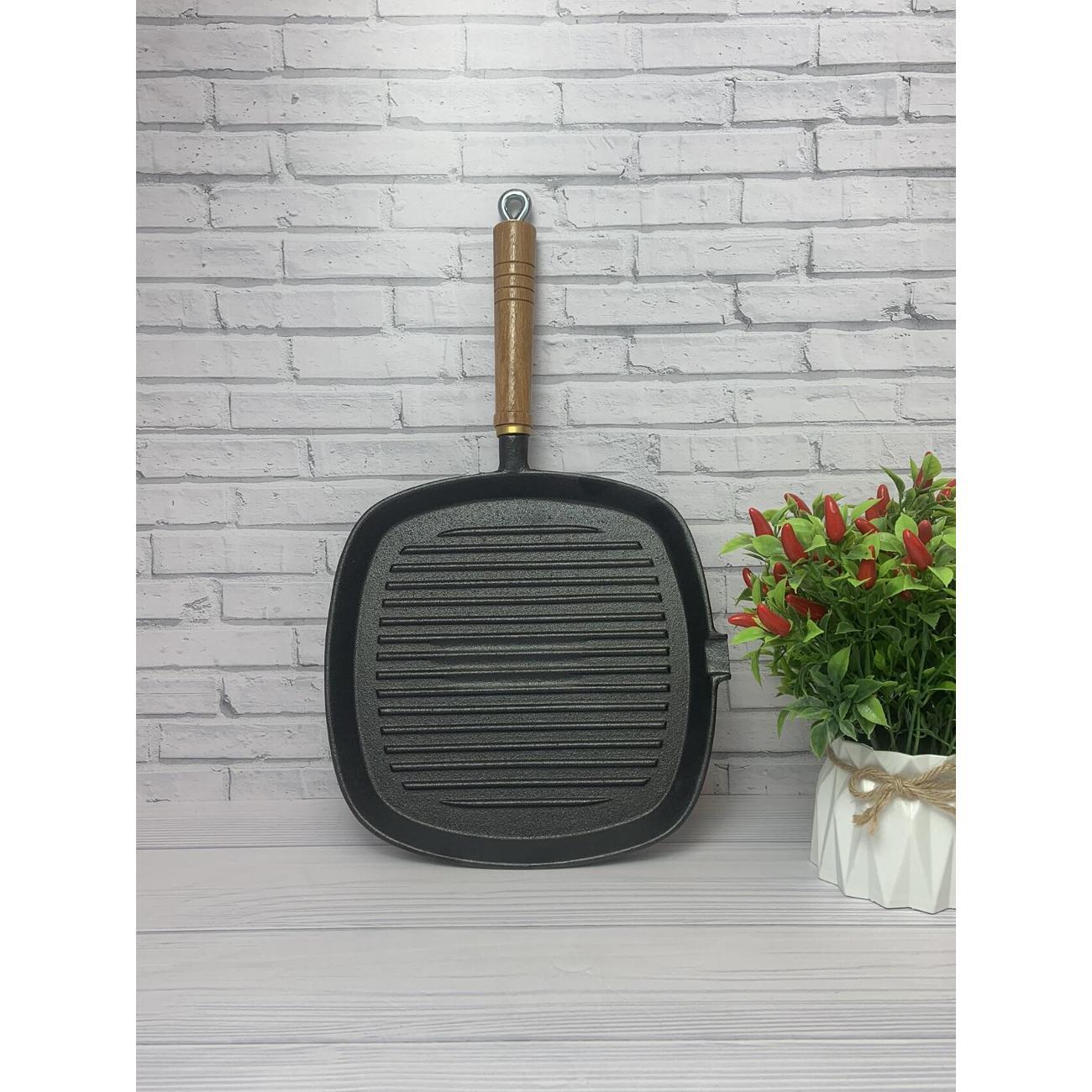 Сковорода квадратная 25х25 см. Высота борта сковороды гриль 5 см. Толстое дно 4 мм долго сохраняет температуру, а съемная удобная деревянная ручка позволит вам готовить с удовольствием. Чугун имеет естественные антипригарные свойства, которые только улучшаются в процессе использования.