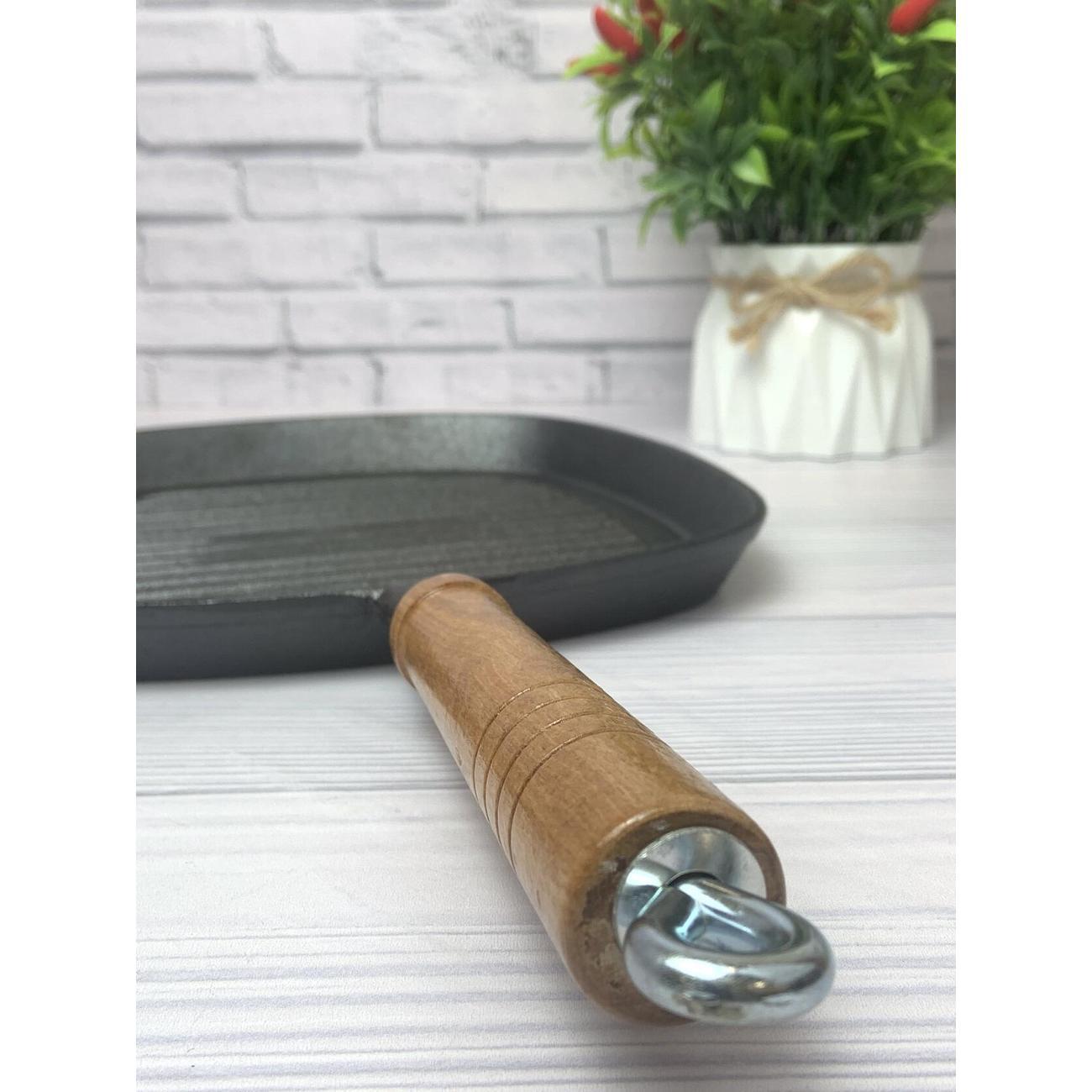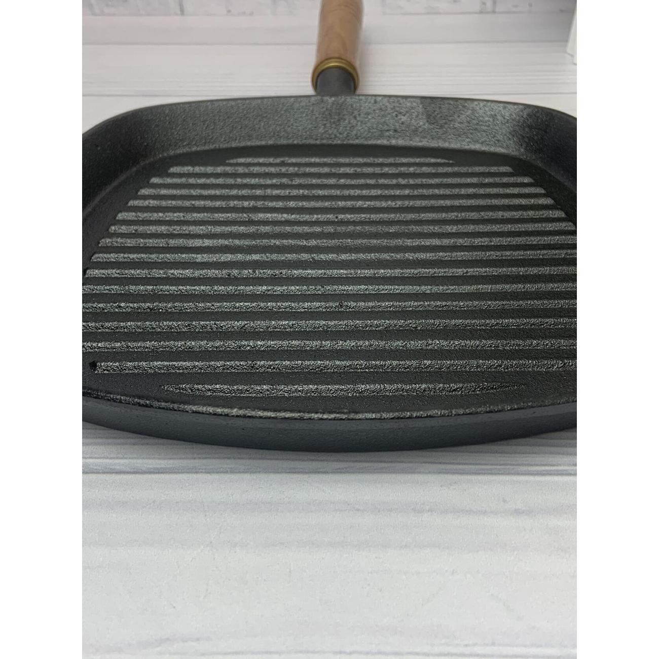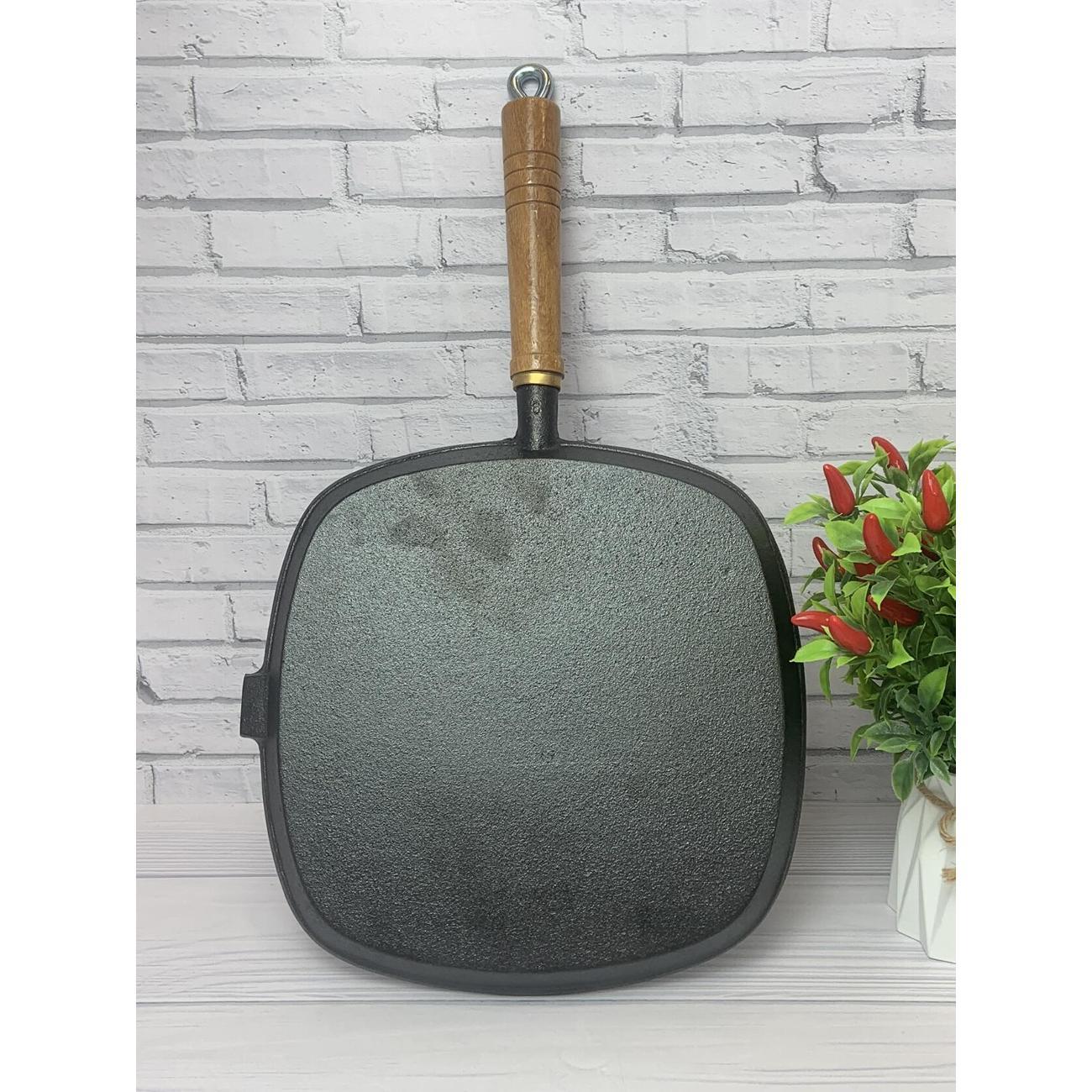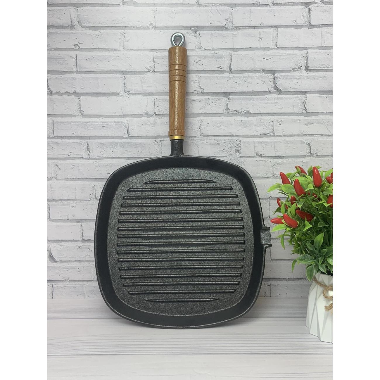 Сковорода квадратная 25х25 см. Высота борта сковороды гриль 5 см. Толстое дно 4 мм долго сохраняет температуру, а съемная удобная деревянная ручка позволит вам готовить с удовольствием. Чугун имеет естественные антипригарные свойства, которые только улучшаются в процессе использования.
