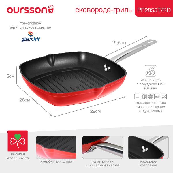 Сковорода-гриль Oursson PF2855T/RD с диаметром дна 28 см, с высотой стенок 5 см весит 1,07 кг. Трехслойное антипригарное покрытие дает возможность использовать при готовке минимум масла и растительного жира. Алюминиевый корпус и рукоять из нержавеющей стали с термостойкой поверхностью устойчивы к механическим и ударным нагрузкам.