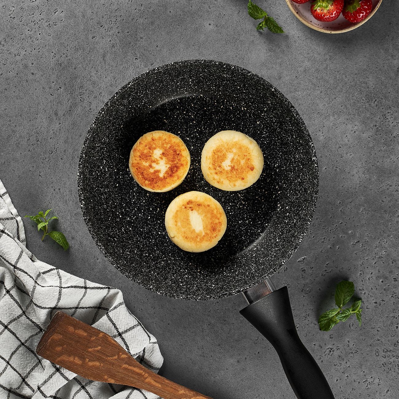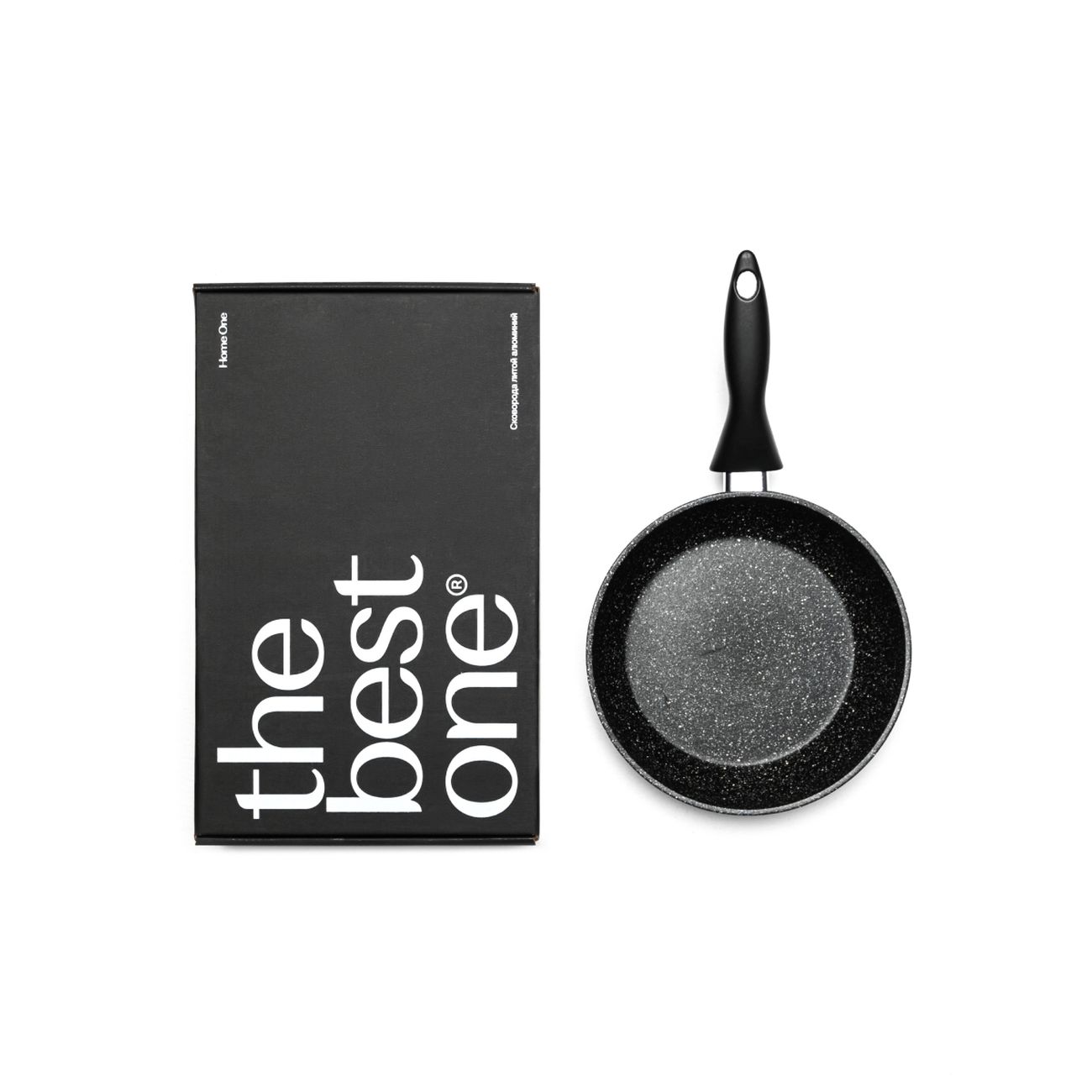Сковорода Home One изготовлена из комбинированных материалов: чаша из алюминия, а ручка из бакелита. Защитное наружное покрытие с включением кристаллов минералов имитирует структуру натурального камня. Внутренняя поверхность изделия покрыта антипригарным составом, а на ручке есть петля для подвешивания. Сковороду можно использовать на газовых, чугунных, стеклокерамических и галогеновых конфорках. Также ее можно мыть в посудомоечной машине.