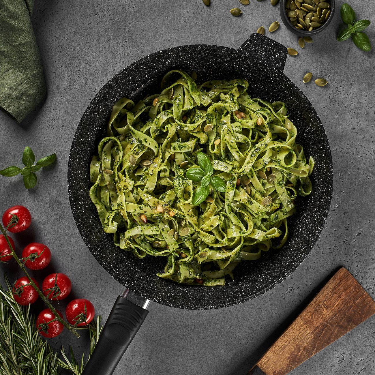 Сковорода Home One изготовлена из комбинированных материалов: чаша из алюминия, а ручка из бакелита. Защитное наружное покрытие с включением кристаллов минералов имитирует структуру натурального камня. Внутренняя поверхность изделия покрыта антипригарным составом, а на ручке есть петля для подвешивания. Сковороду можно использовать на газовых, чугунных, стеклокерамических и галогеновых конфорках. Также ее можно мыть в посудомоечной машине.