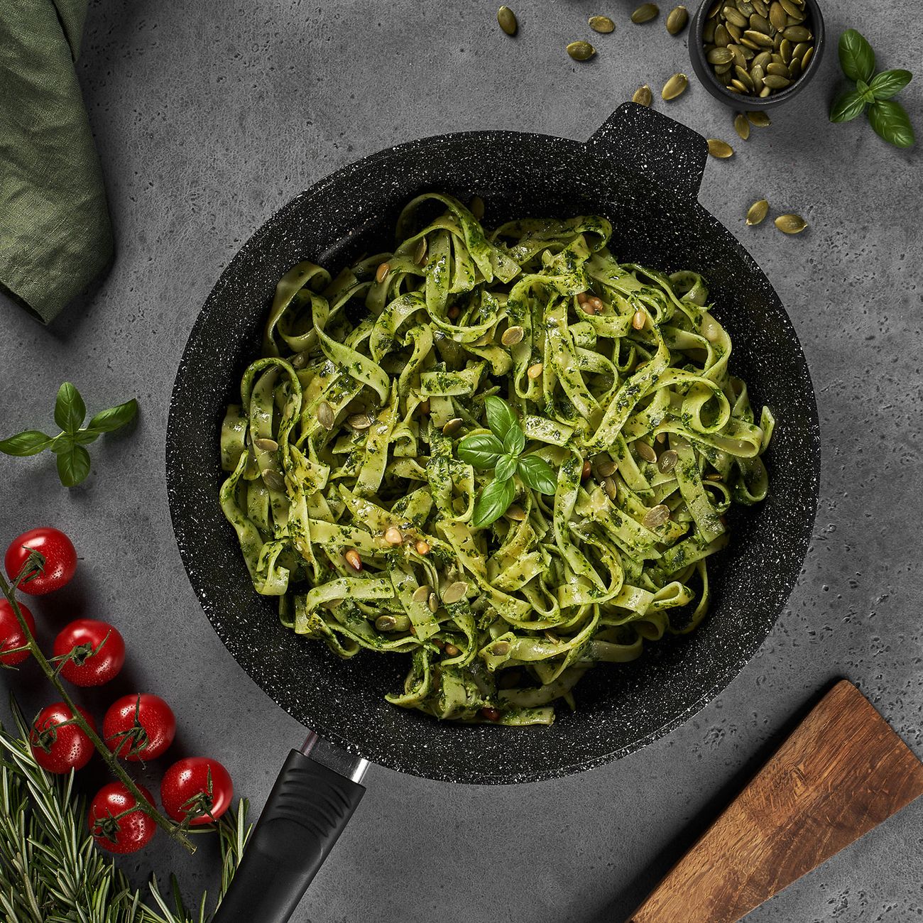 Сковорода Home One изготовлена из комбинированных материалов: чаша из алюминия, а ручка из бакелита. Защитное наружное покрытие с включением кристаллов минералов имитирует структуру натурального камня. Внутренняя поверхность изделия покрыта антипригарным составом, а на ручке есть петля для подвешивания. Сковороду можно использовать на газовых, чугунных, стеклокерамических и галогеновых конфорках. Также ее можно мыть в посудомоечной машине.