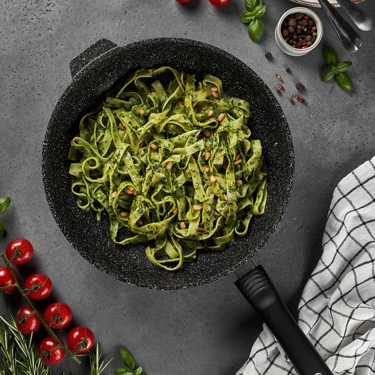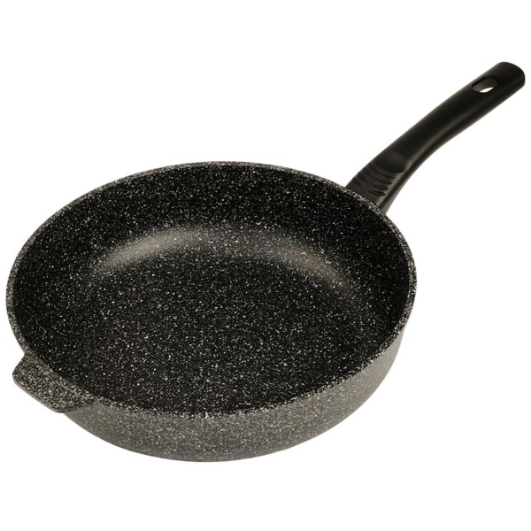 Сковорода Home One изготовлена из комбинированных материалов: чаша из алюминия, а ручка из бакелита. Защитное наружное покрытие с включением кристаллов минералов имитирует структуру натурального камня. Внутренняя поверхность изделия покрыта антипригарным составом, а на ручке есть петля для подвешивания. Сковороду можно использовать на газовых, чугунных, стеклокерамических и галогеновых конфорках. Также ее можно мыть в посудомоечной машине.