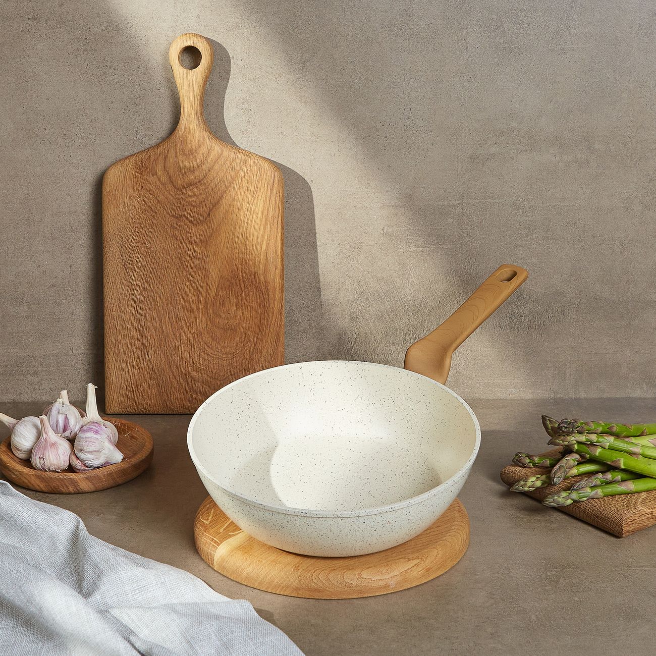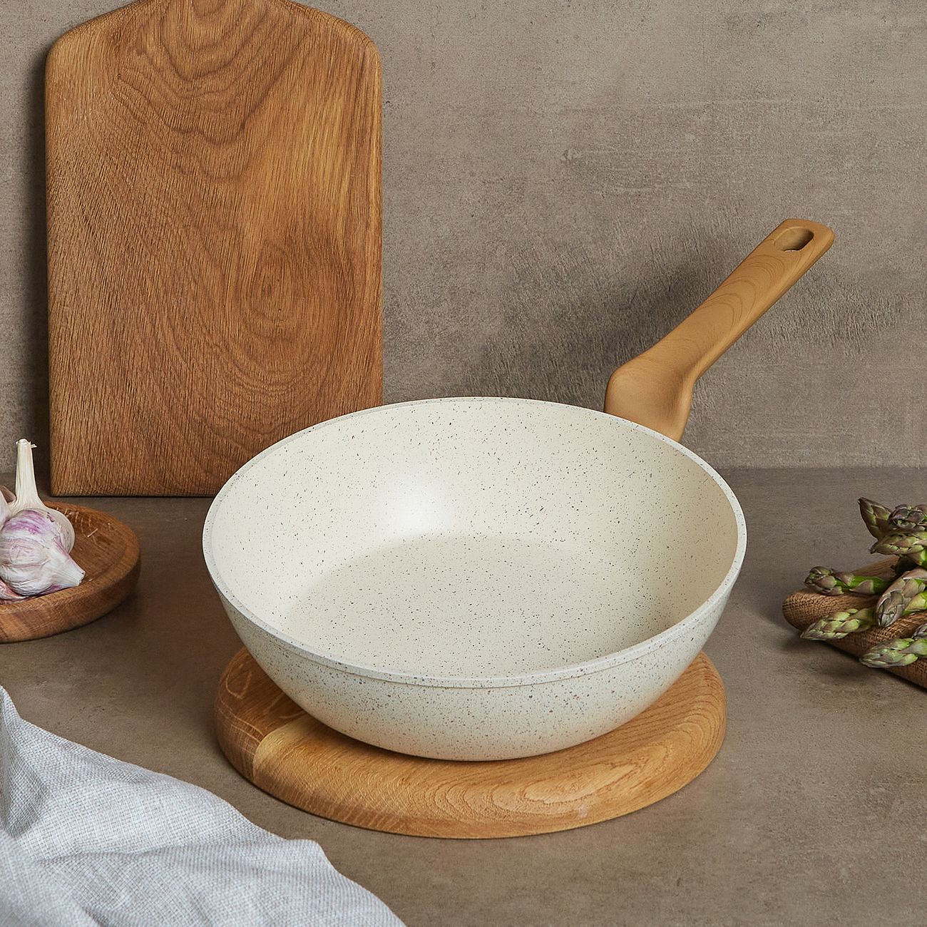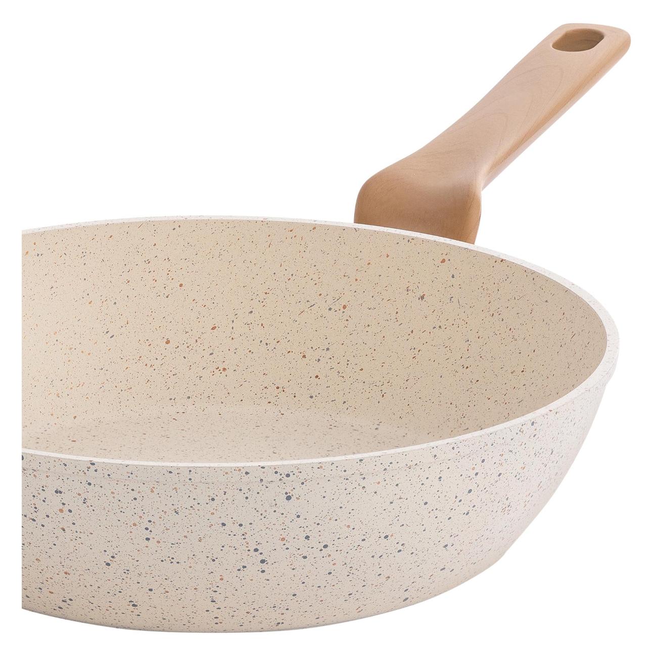 Мне очень нравится именно светлая посуда. Да и если делать фотографии своей готовки, то на светлом фоне продукты яркого цвета смотрятся гораздо интереснее. Ручка удобная. У меня дома газовая плита, сковородка на ней стоит устойчиво. Консультант говорил, что можно смело отправлять сковородку в посудомоечную машину. Но мы пока её еще не купили, моем посуду руками