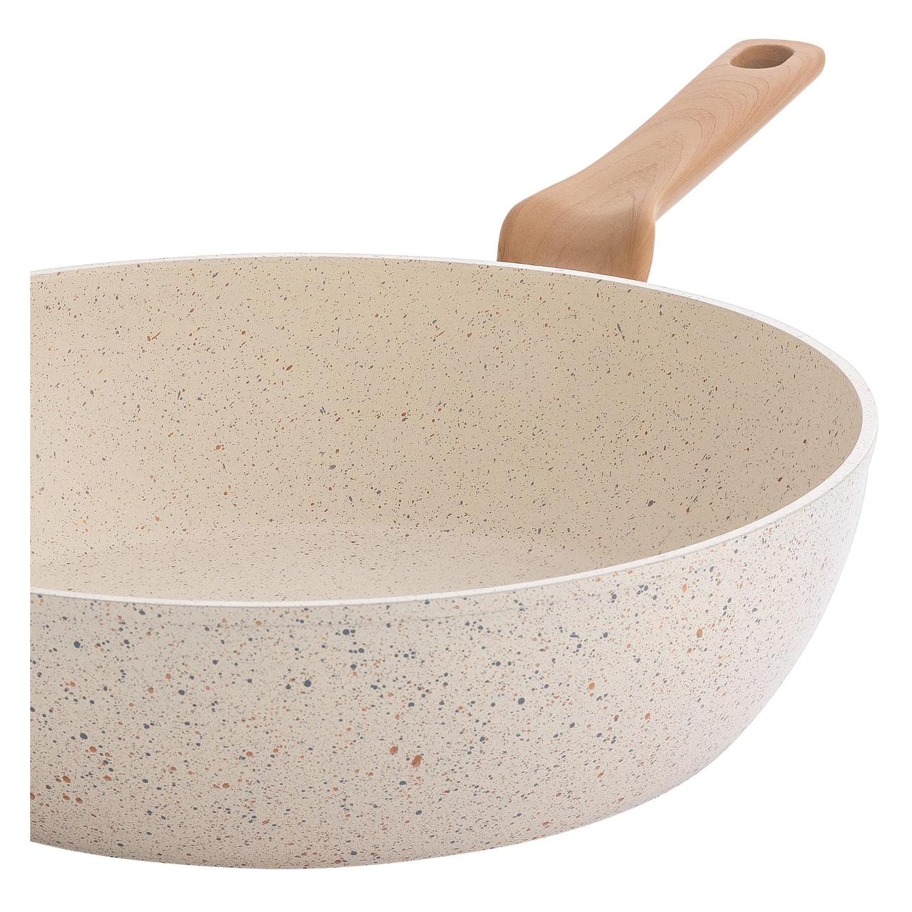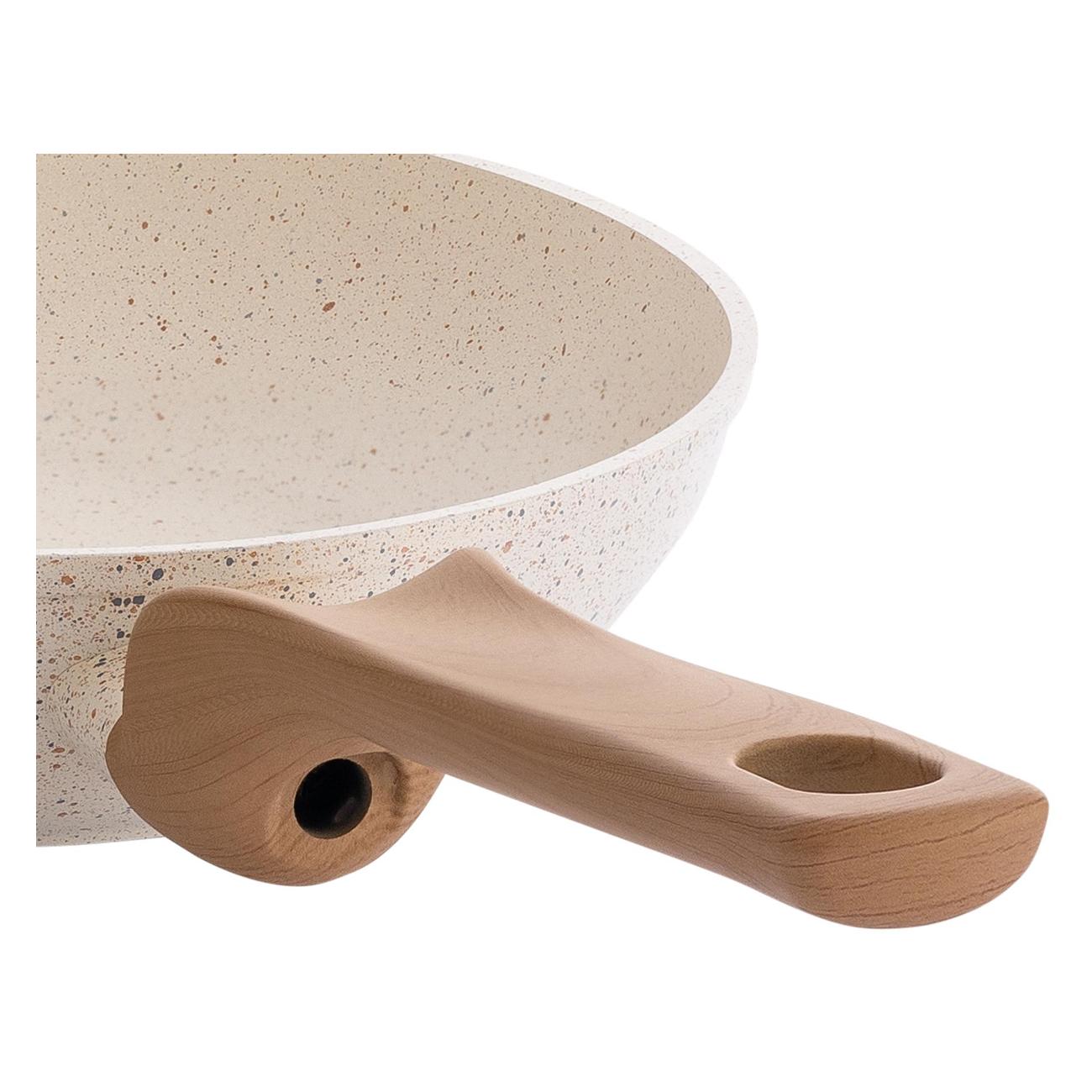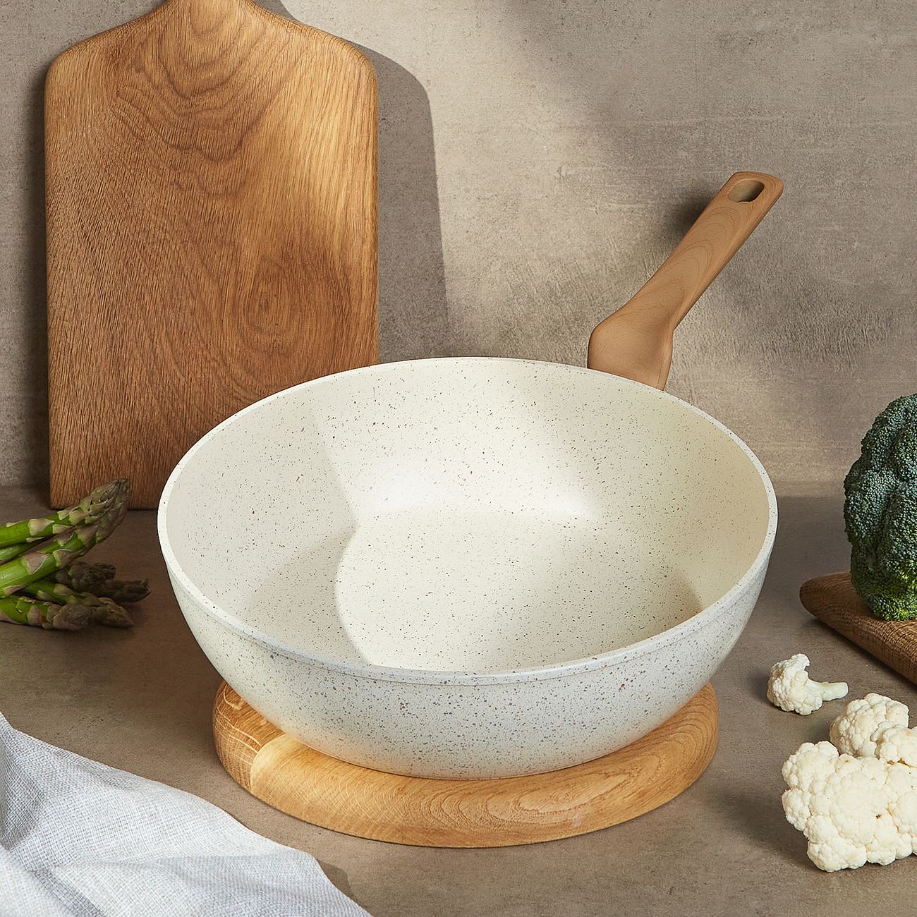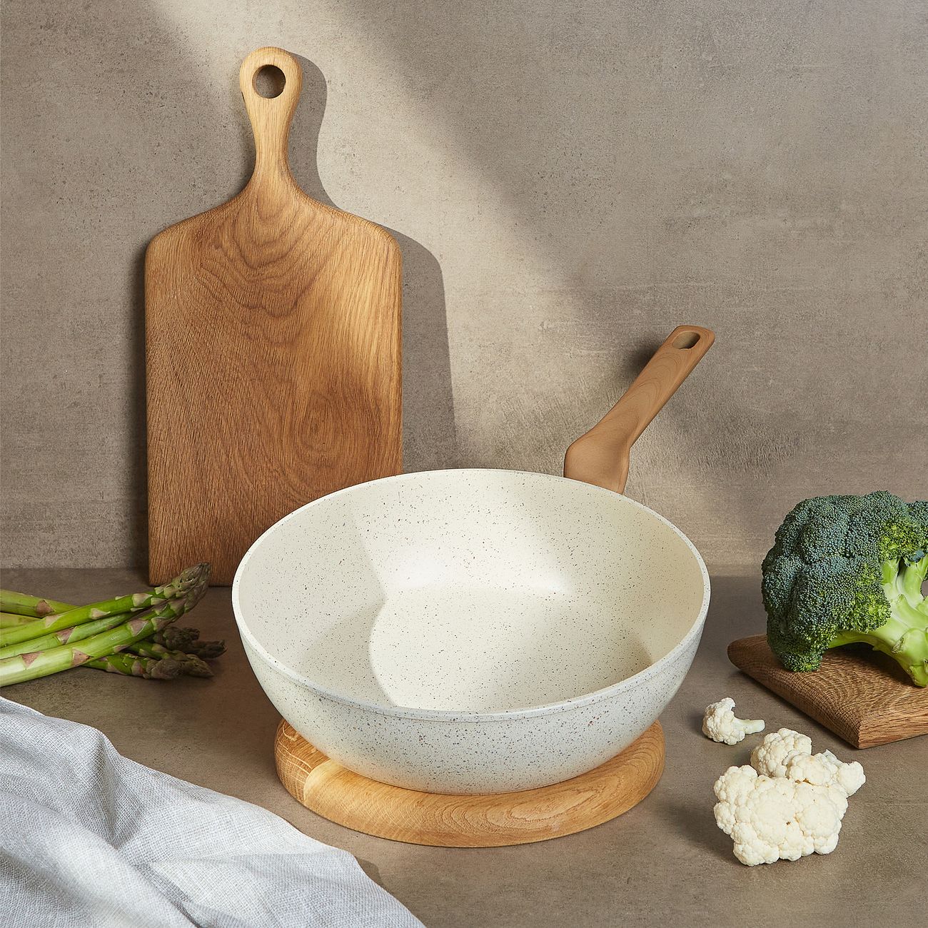 Готовлю на этой сковороде чуть ли не каждый день, очень нравится. Сковорода красивая, из хорошего материала – алюминия. Легкая такая, но борта высокие. Антипригарное покрытие, вроде ничего не прилипло еще.