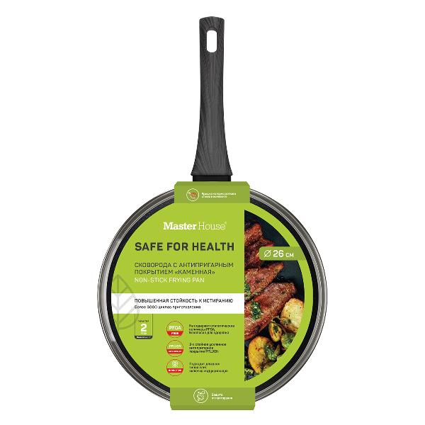 Сковорода Master House «Шеф Даниэль» диаметром 26 см обладает антипригарным покрытием и встроенным диском, предотвращающим деформацию дна. Конструкция сделана из кованого алюминия, окрашена в черный и серый цвета. Посуду можно использовать на любых видах плит, очищать в посудомоечной машине. Размеры модели — 24х18,5х4,8 см, вес — 783 г.