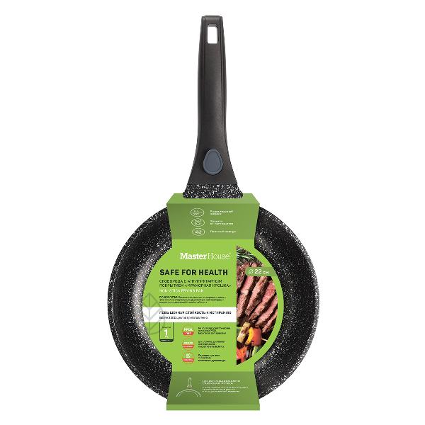 Сковорода Master House «Шеф Леоне» диаметром 22 см подойдет для приготовления блюд на конфорках любых типов и в духовом шкафу — для этого нужно снять ручку. Сковорода выполнена из литого алюминия и оснащена двухслойным антипригарным покрытием «Мраморная крошка» толщиной 25-30 мкм. Оно обладает повышенной устойчивостью к истиранию и рассчитано более чем на 3000 циклов. Ручка изготовлена из бакелита. Утварь можно мыть в посудомоечной машине.