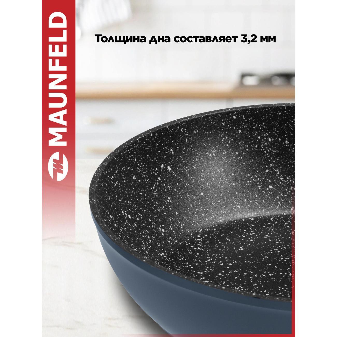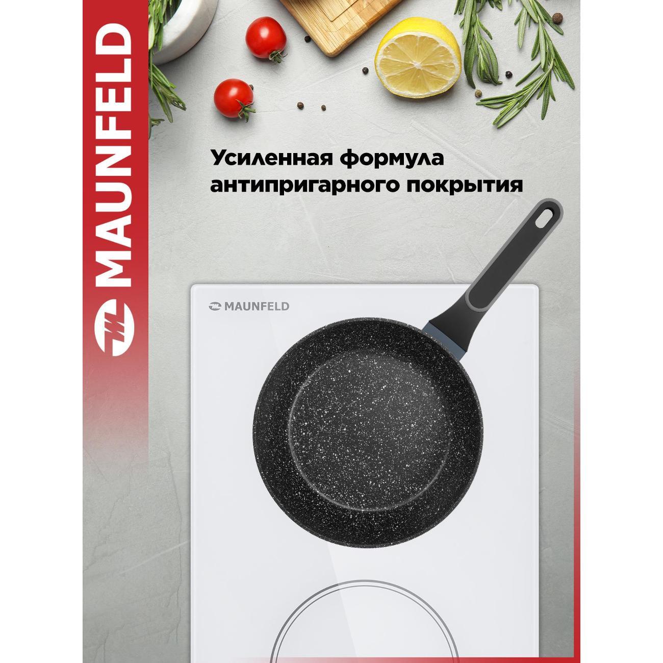 Сковорода Maunfeld MDP24FA02DG обладает мраморным антипригарным покрытием. Совместима со всеми типами плиты, включая индукционные. Диаметр изделия составляет 24 см, рабочей поверхности — 18,4 см. Присутствует термоизоляционная ручка черного цвета, длиной 19,3 см. Выполнена из материала Soft Touch и оборудована петлей для подвешивания. Корпус прибора изготовлен из кованого алюминия. Модель подходит для мытья в посудомоечной машине. Оснащена антидеформационным диском. Товар произведен в Китае. Вес — 2 кг.