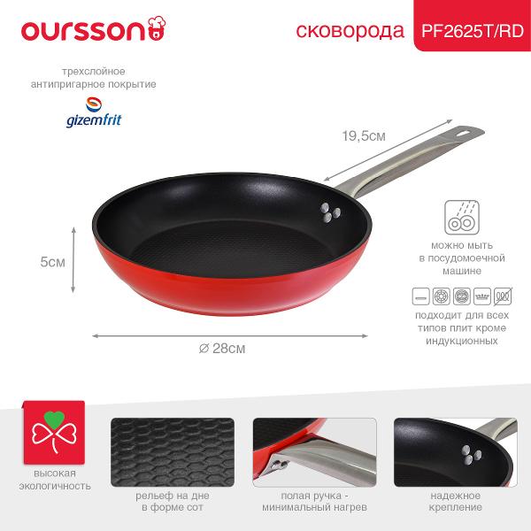 Сковорода Oursson PF2625T/RD габаритами 5х26 см, с диаметром дна 24 см весит 0,92 кг. Трехслойное антипригарное покрытие дает возможность готовить с минимальным количеством масла и жира. Внутренняя градуировка показывает степень наполнения изделия. Антидеформационный диск обеспечивает равномерное распределение тепла.