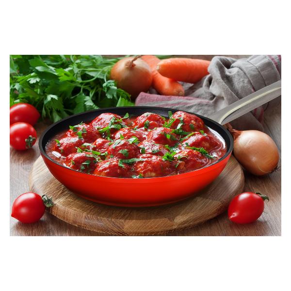 Рукоять эргономичной формы не нагревается при готовке. В ее верхней части располагается отверстие для подвеса, что позволяет хранить утварь на кухонном рейлинге. Модель подходит для нагрева на газовых, стеклокерамических, галогенных, чугунных конфорках, в духовке. Ее можно мыть руками или в посудомоечной машине обычными средствами.