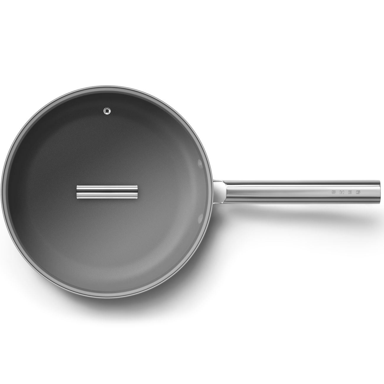 Сковорода Smeg изготовлена из кованного алюминия. Диаметр модели составляет 28 см, диаметр рабочей поверхности — 21,4 см. Дно многослойное, покрытие хорошо распределяет тепло. Сковорода подходит для всех типов кухонных плит. Модель можно применять для приготовления пищи в духовом шкафу. Возможна мойка в посудомоечной машине.