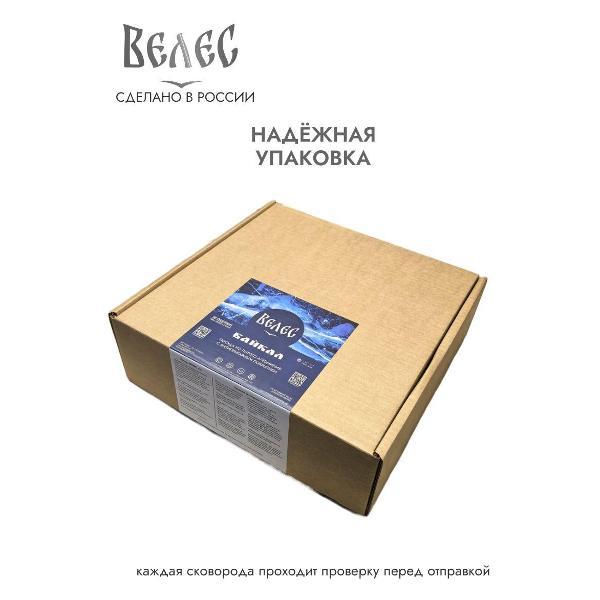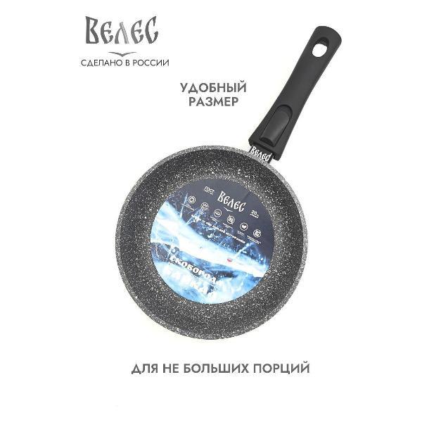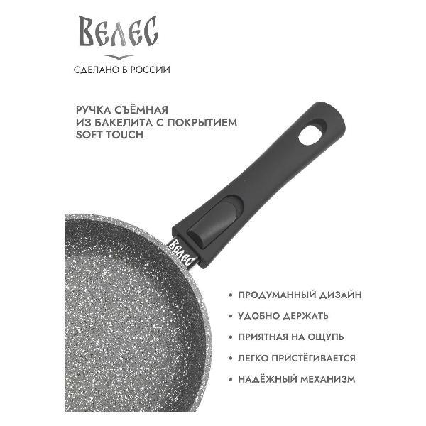 Литой корпус толщиной 5 мм и дно 6 мм исключает деформацию посуды. Высочайшее качество, в соответствии требованиям ГОСТ Р 56674-2018. Антипригарное покрытие долговечно и абсолютно безопасно - без вредных примесей и без PFOA. Линия выполнена в стиле ЭКОдизайн, эксклюзивное цветовое решение специально разработано для торговой марки «ВЕЛЕС».