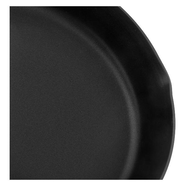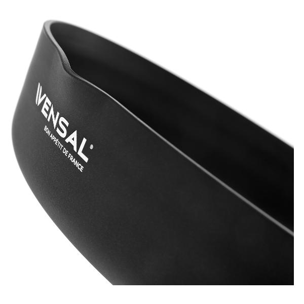 Сковорода Vensal VS1024 выполнена из алюминиевого сплава, на корпусе есть специальный желоб для слива жидкости. Ручка модели произведена из бакелита, окрашенного в красный цвет, с напылением из силикона. Диаметр сковородки составляет 260 мм, а диаметр дна при толщине 2,8 мм — 22,3 см. Модель подходит для использования со всеми видами плит и для мытья в посудомоечной машине.