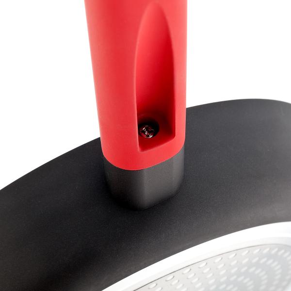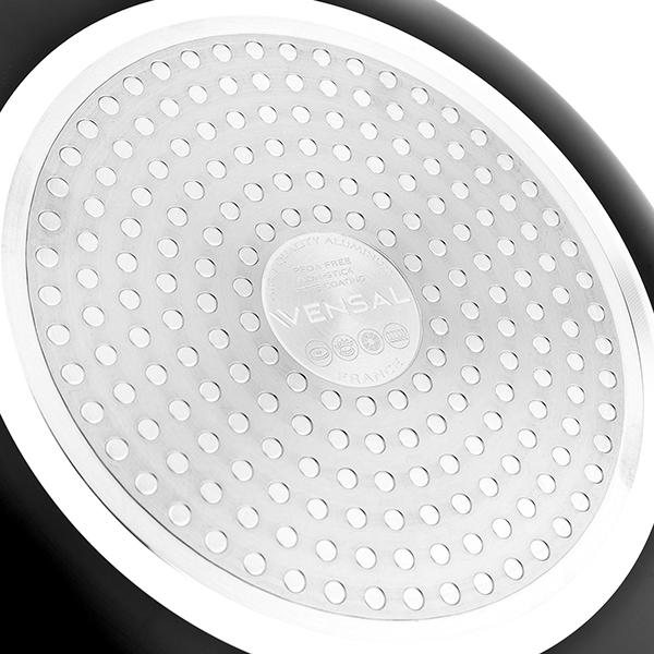 Сковорода Vensal VS1025 выполнена из алюминиевого сплава, на корпусе есть специальный желоб для слива жидкости. Ручка модели произведена из бакелита, окрашенного в красный цвет, с напылением из силикона. Диаметр сковородки составляет 280 мм, а диаметр дна при толщине 2,8 мм — 23,8 см. Модель подходит для использования со всеми видами плит и для мытья в посудомоечной машине.