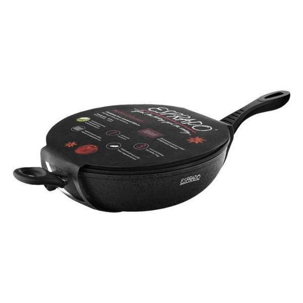 Сковорода вок Esprado RUST28BE105, сделанная из алюминия, дополнена бакелитовой термоизолированной ручкой. Предусмотрены антипригарное покрытие и отверстие для подвешивания, обеспечивающее удобное хранение. Модель подходит для нагрева на конфорках любого типа, в том числе индукционных. После использования разрешается очистка в посудомоечной машине. В комплект входит стеклянная крышка с клапаном, через который выходит пар. Диаметр — 28 см, высота — 8 см, вес — 1,9 кг.