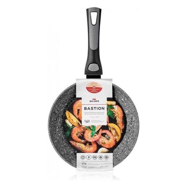 Сковорода Walmer Bastion W10062447 стандартного типа изготовлена из алюминия. Рабочая поверхность составляет 16,5 см при высоте — 10 см, ширине — 25 см. Съемная серая ручка помогает занимать меньше места при хранении, изготовлена из силикона и бакелита. Изнутри сковорода обработана антипригарным покрытием. Для упрочнения корпуса встроен антидеформационный диск. Нагрев осуществляется на газовых, индукционных, чугунных, стеклокерамических, галогеновых конфорках и в духовке. Очищать модель возможно в посудомоечной машине. Цвет — серый. Общая масса — 0,95 кг.