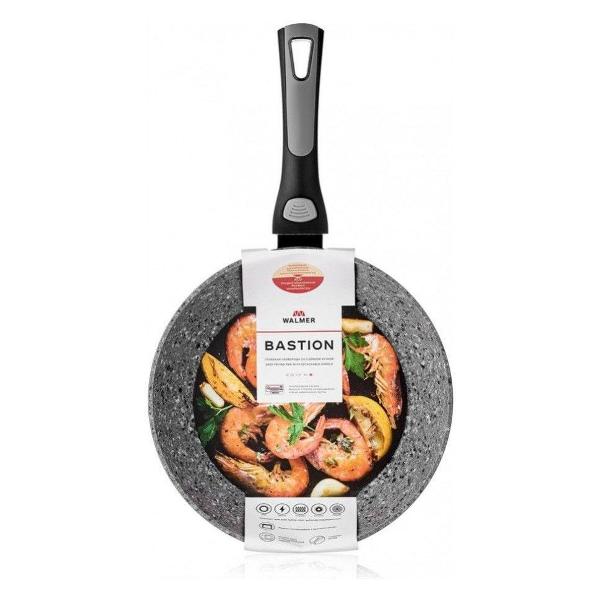 Сковорода Walmer Bastion W10062652 стандартного типа изготовлена из алюминия. Рабочая поверхность составляет 19 см при высоте — 9 см, ширине — 27 см. Съемная серая ручка помогает занимать меньше места при хранении, изготовлена из силикона и бакелита. Изнутри сковорода обработана антипригарным покрытием. Для упрочнения корпуса встроен антидеформационный диск. Нагрев осуществляется на газовых, индукционных, чугунных, стеклокерамических, галогеновых конфорках и в духовке. Очищать модель возможно в посудомоечной машине. Цвет — серый. Общая масса — 1 кг.