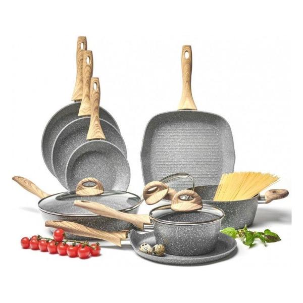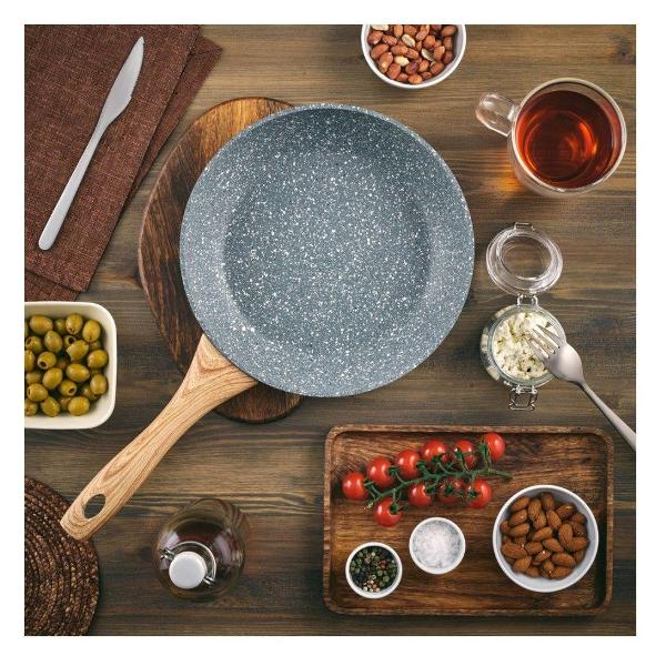 Сковорода Walmer Stonehenge W10162402 выполнена в алюминиевом корпусе диаметром 24 см. Дно диаметром 18 см утолщено (толщина составляет 3,4 мм), оснащено антидеформационным диском. Высота стенок составляет 8 см. Термоизолированная ручка из бакелита оборудована петлей для подвешивания. Цвет ручки — бежевый. Посуда используется на всех источниках нагрева. Разрешено мыть в посудомоечной машине.
