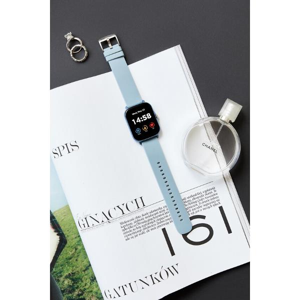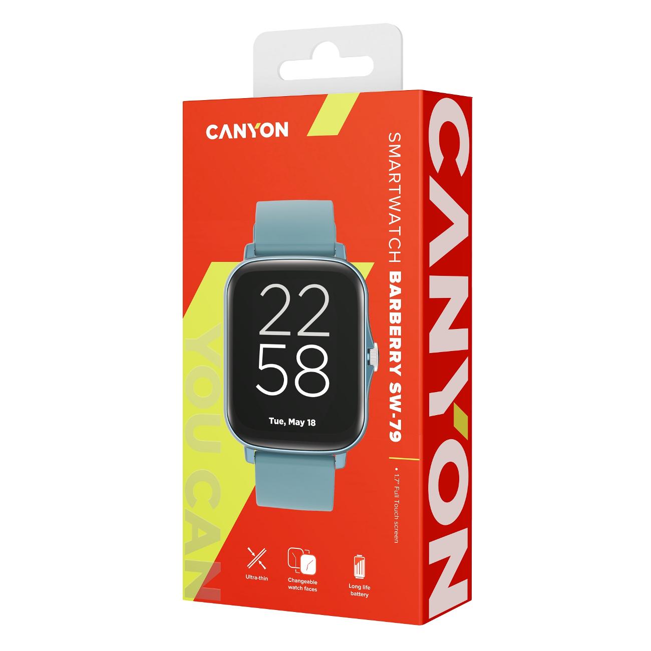 Смарт-часы Canyon Barberry SW-79 в голубом металлическом корпусе оснащены сенсорным экраном с удобным настраиваемым циферблатом. Дополнительно есть управление с помощью механического колесика на корпусе. Размер дисплея 1,7 дюйма, разрешение — 240x280 точек. Зарядки хватает в среднем на 5-7 дней использования в обычном режиме. Заявленный уровень защиты IP67 — этого достаточно, чтобы часы пережили небольшое погружение в воду. Активность считывается встроенными акселерометром и пульсометром. Дополнительно предусмотрен мониторинг сна.