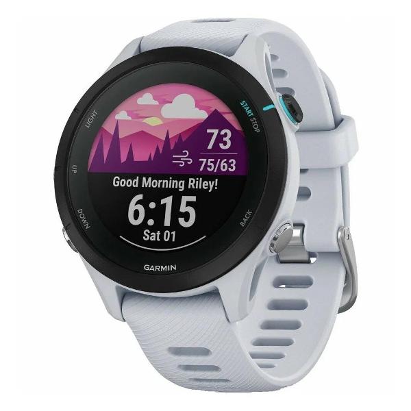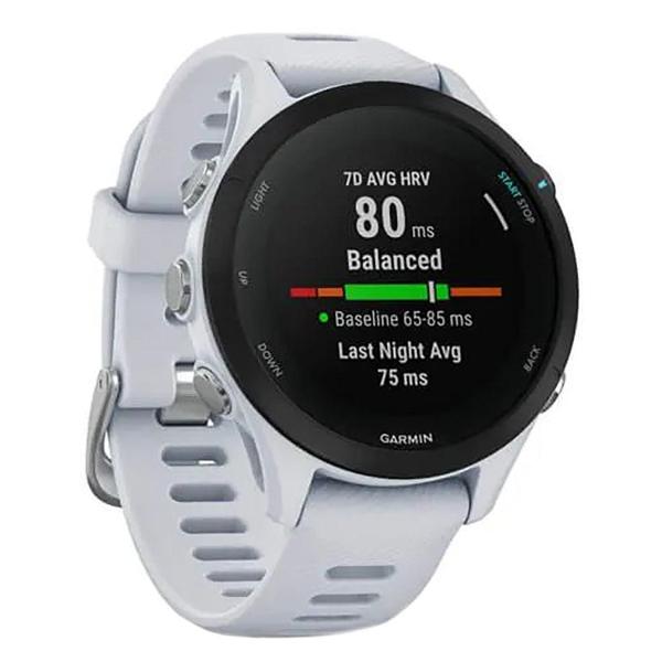 Смарт-часы Garmin Forerunner 255, белый камень — модель среднего класса с беговыми функциями, метриками и анализом данных. Девайс весом 49 г выполнен в водонепроницаемом (5 Атм) корпусе, оснащен гибким силиконовым браслетом и круглым MIP-экраном диагональю 1,3 дюйма. Для управления функциями предусмотрены пять боковых кнопок. Стекло Corning Gorilla Glass 3 защищает дисплей от повреждений.