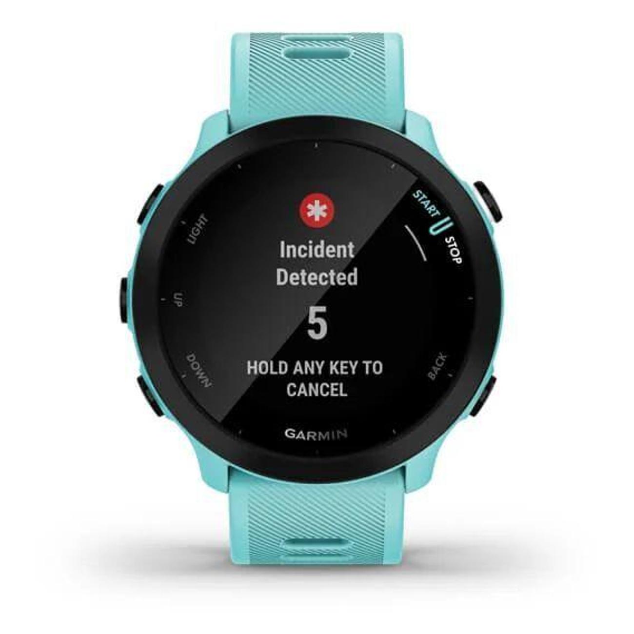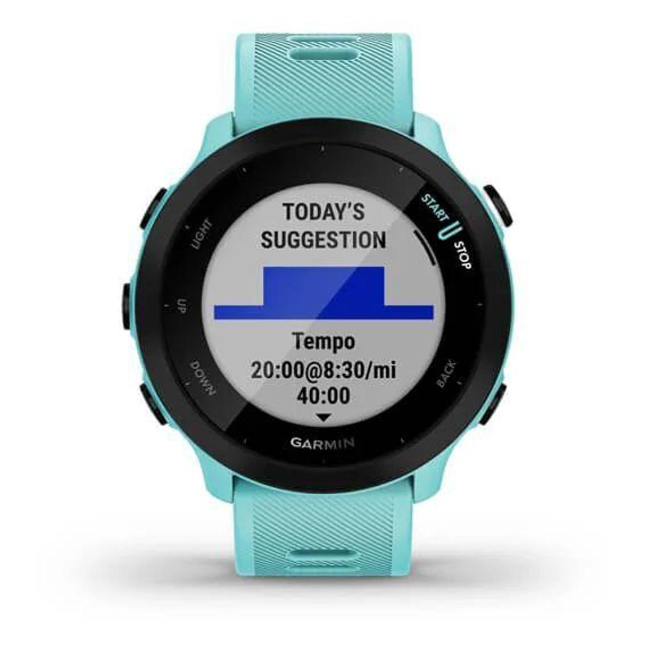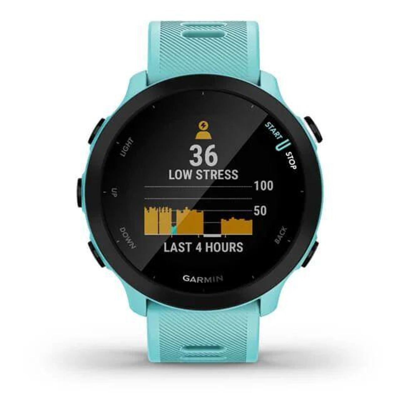 Смарт-часы Garmin Forerunner 55 Aqua представляют собой функциональное устройство с широким спектром возможностей для занятий спортом, отслеживания физической активности, контроля здоровья. Часы оснащены функцией мониторинга сердечного ритма, измерения пульса, отслеживания ритма сна, показателей плавания. Встроены счетчик калорий, шагомер, компас. Датчик ускорения (G-сенсор) измеряет ускорение и применяется для автоматического поворота экрана в удобное положение. Устройство работает от литий-ионного аккумулятора емкостью 500 мА*ч в течение двух недель. Зарядка происходит от USB-порта.