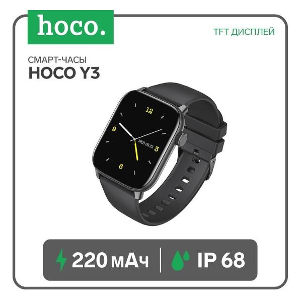 Смарт-часы Hoco Y3 черного цвета оснащены прямоугольным сенсорным экраном с подсветкой. Диагональ дисплея — 1,69". Объем оперативной памяти составляет 256 КБ, встроенной — 128 МБ. Устройство поддерживает 13 языков, оснащено функцией информационных напоминаний. Способ передачи данных — с помощью Bluetooth версии 5.0. Модель совместима с операционной системой Android 5.0 и iOS 10. Водостойкий корпус сделан из прочного металла с антикоррозийными свойствами, ремешок — из мягкого силикона. Присутствуют датчик движения, счетчик калорий, шагомер, пульсометр.