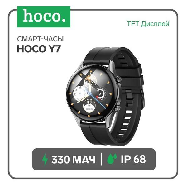Смарт-часы Hoco Y7 черного цвета совместимы с ОС Android 5.0 и iOS 10. В приложении можно выбрать один из циферблатов. Устройство оснащено круглым сенсорным дисплеем с подсветкой (диагональ — 1,32"). Объем оперативной памяти составляет 192 КБ, встроенной — 128 МБ. Класс водонепроницаемости корпуса — IP68. В комплекте идет силиконовый ремешок универсального размера. Присутствует счетчик калорий, датчик движения, термометр, пульсометр. Связь с компьютером поддерживается с помощью модуля Bluetooth 5.0. Емкость батареи составляет 330 мА*ч.
