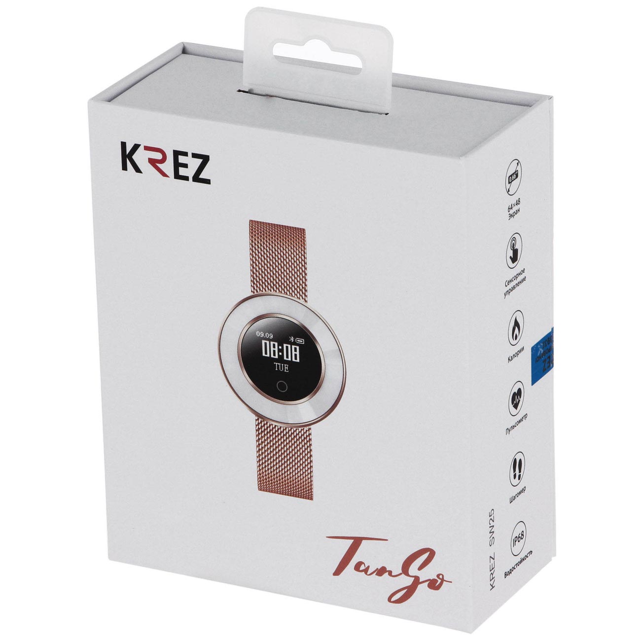 Krez Tango – стильные смарт-часы, оборудованные круглым монохромным OLED-дисплеем. Они изготовлены из металла и стекла и комплектуются прочным стальным ремешком. Благодаря защите корпуса, соответствующей стандарту IP68, устройству не страшны пыль и влага, и им смело можно пользоваться в сильный дождь. Аккумулятор ёмкостью 90 мАч обеспечивает до 8 часов работы без подзарядки.