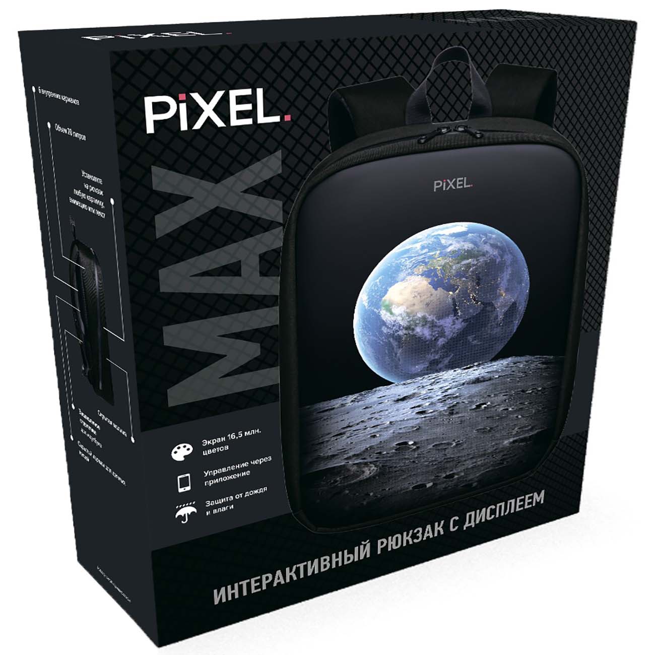 Флагманский рюкзак Pixel Bag Max оснащен ярким светодиодным дисплеем, встроенным во внешнюю часть корпуса. В выключенном состоянии экран незаметен, поскольку полностью интегрирован в ткань. Чтобы устанавливать различные изображения, надписи и анимации достаточно воспользоваться бесплатным приложением на Android/iOS.