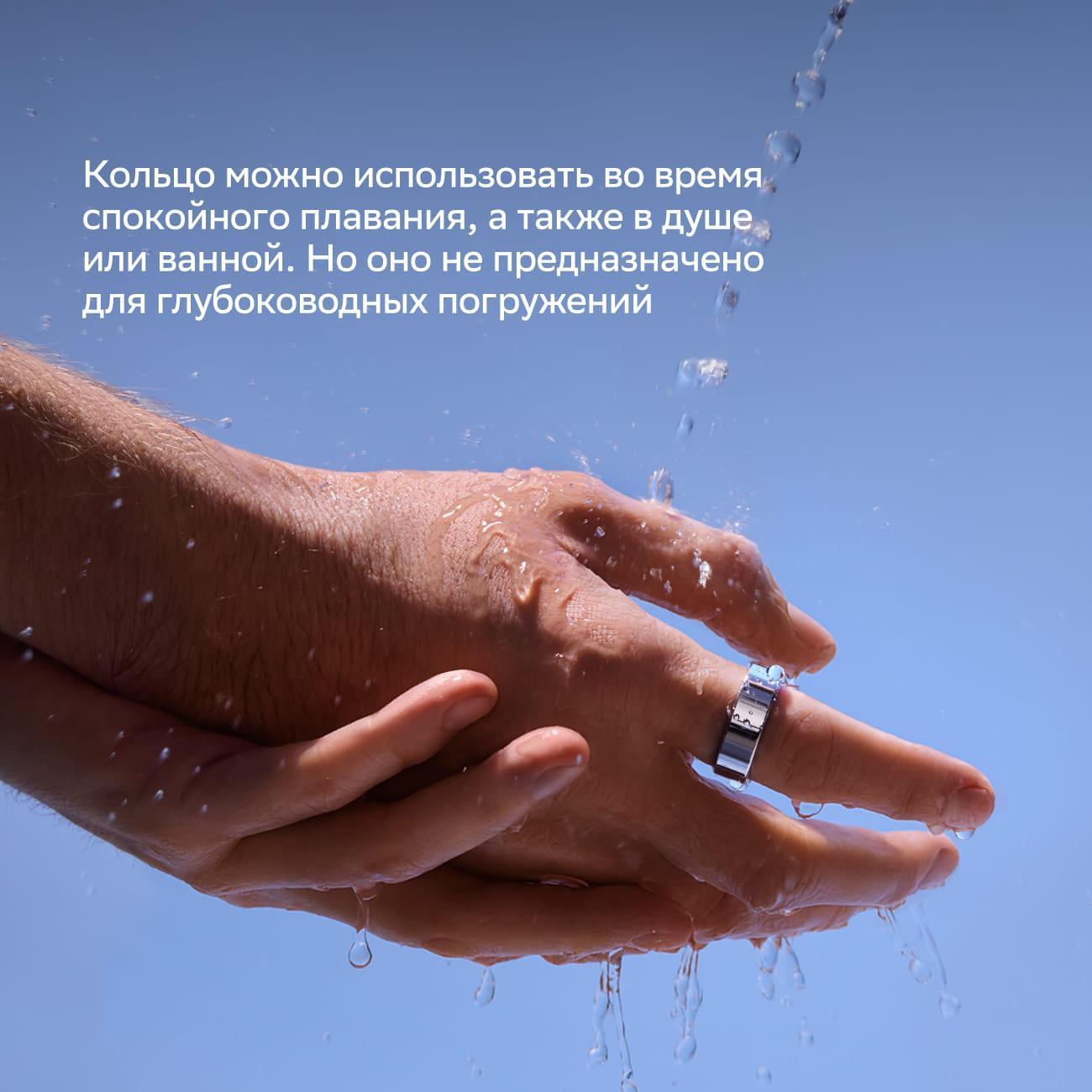 Кольцо изготовлено из титанового сплава и гипоаллергенного полимерного материала. За счет водонепроницаемого корпуса аксессуар можно не снимать при спокойном плавании, в ванной или душе.