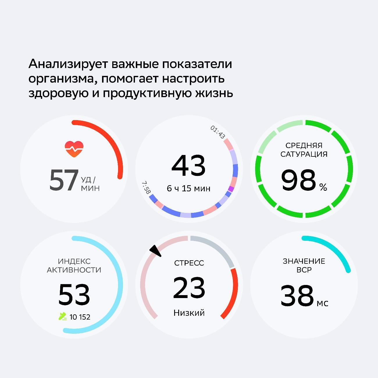 Датчики устройства отслеживают физиологические показатели: пульс, сатурацию, физическую активность, фазы сна и пробуждение. Форм-фактор кольца позволяет проводить максимально точные измерения благодаря плотному прилеганию к пальцу, где сосуды расположены близко к поверхности кожи. Кольцо мониторит параметры здоровья и фиксирует их изменения, помогая поддерживать организм в оптимальном состоянии.