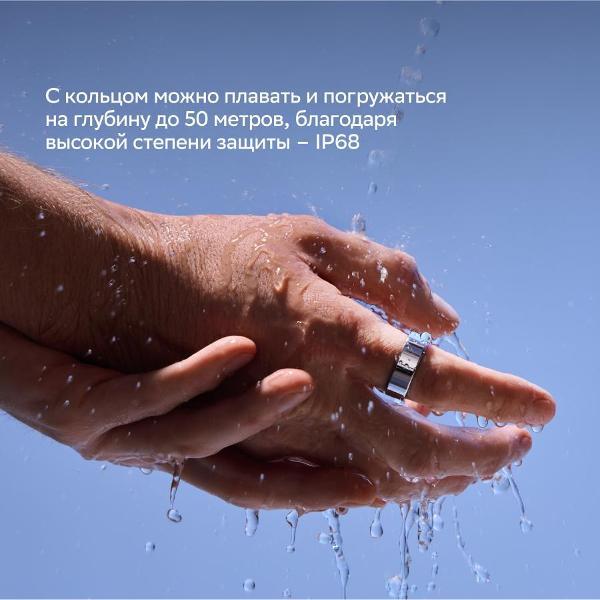Кольцо изготовлено из титанового сплава и гипоаллергенного полимерного материала. За счет водонепроницаемого корпуса аксессуар можно не снимать при спокойном плавании, в ванной или душе.