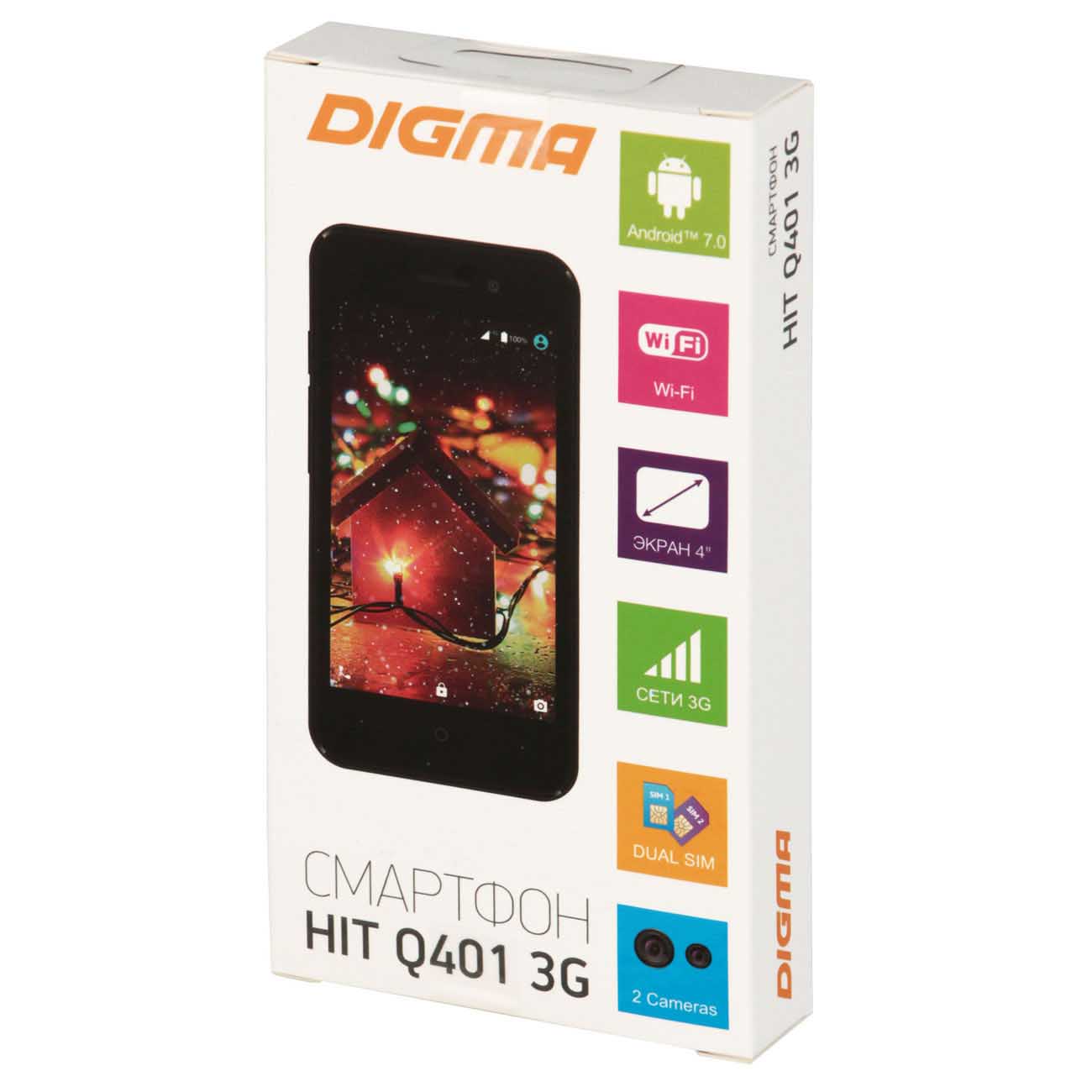 Digma HIT Q401 – компактный смартфон, предлагающий всё необходимое для повседневного использования. Он снабжён камерой с автофокусом и вспышкой, спутниковой антенной GPS, FM-радиоприёмником и беспроводным модулем Bluetooth.