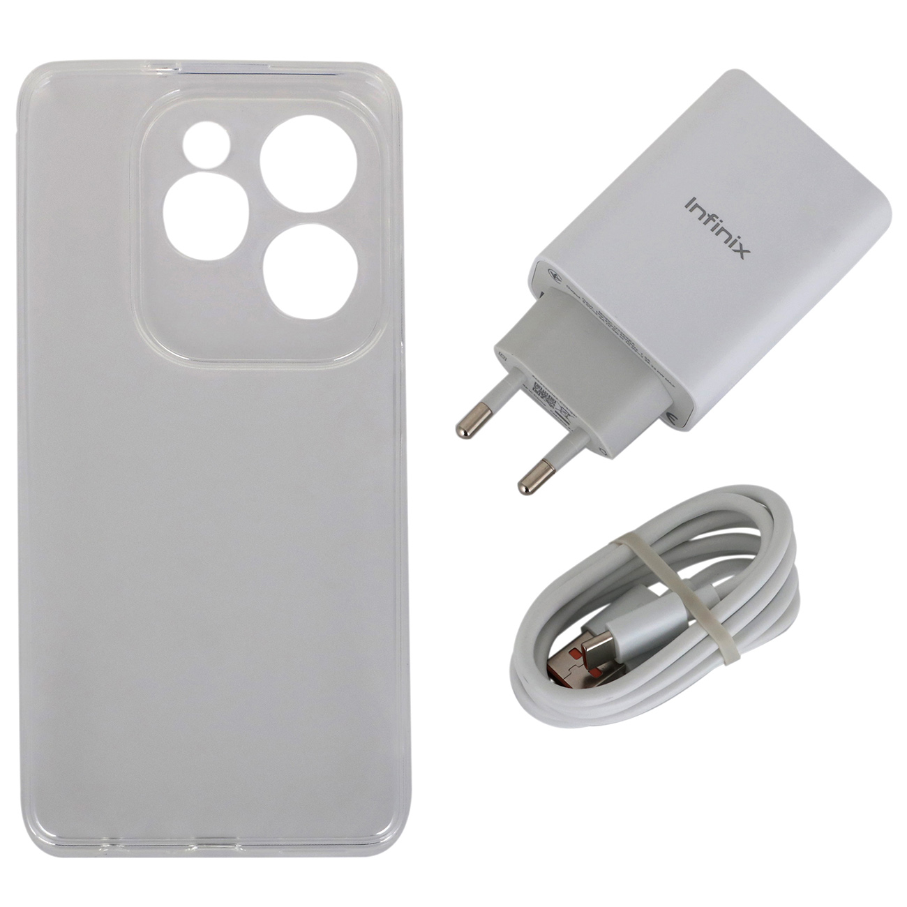Корпус Infinix HOT 40 изготовлен из пластика. Для подключения наушников встроен 3,5-миллиметровый разъем. Аккумулятор, обладающий емкостью 5000 мА*ч, поддерживает быструю зарядку (33 Вт). В комплекте со смартфоном поставляются кабель USB-Type C для зарядки и подключения к компьютеру, пленка для стекла и чехол.
