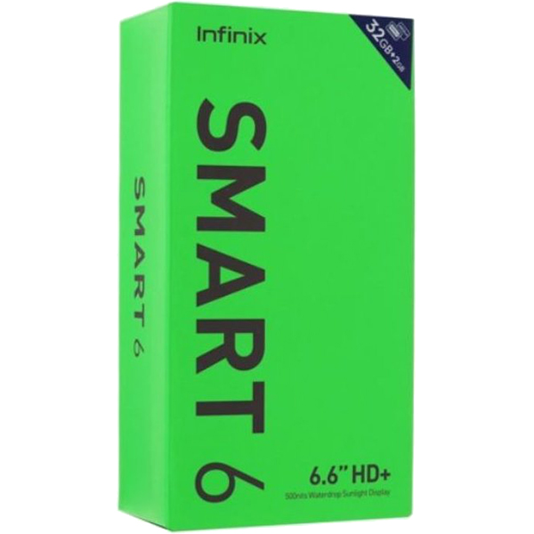 Смартфон Infinix Smart 6 оснащен двумя основными и одной фронтальной камерой. Диагональ экрана устройства составляет 6,6 дюймов. Процессор у смартфона восьмиядерный, Spreadtrum SC9863 1.6 ГГц. Объем оперативной памяти 2 Гб, а встроенной — 32 Гб. Есть слот под карту памяти объемом до 512 Гб.