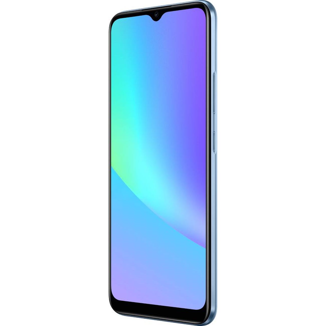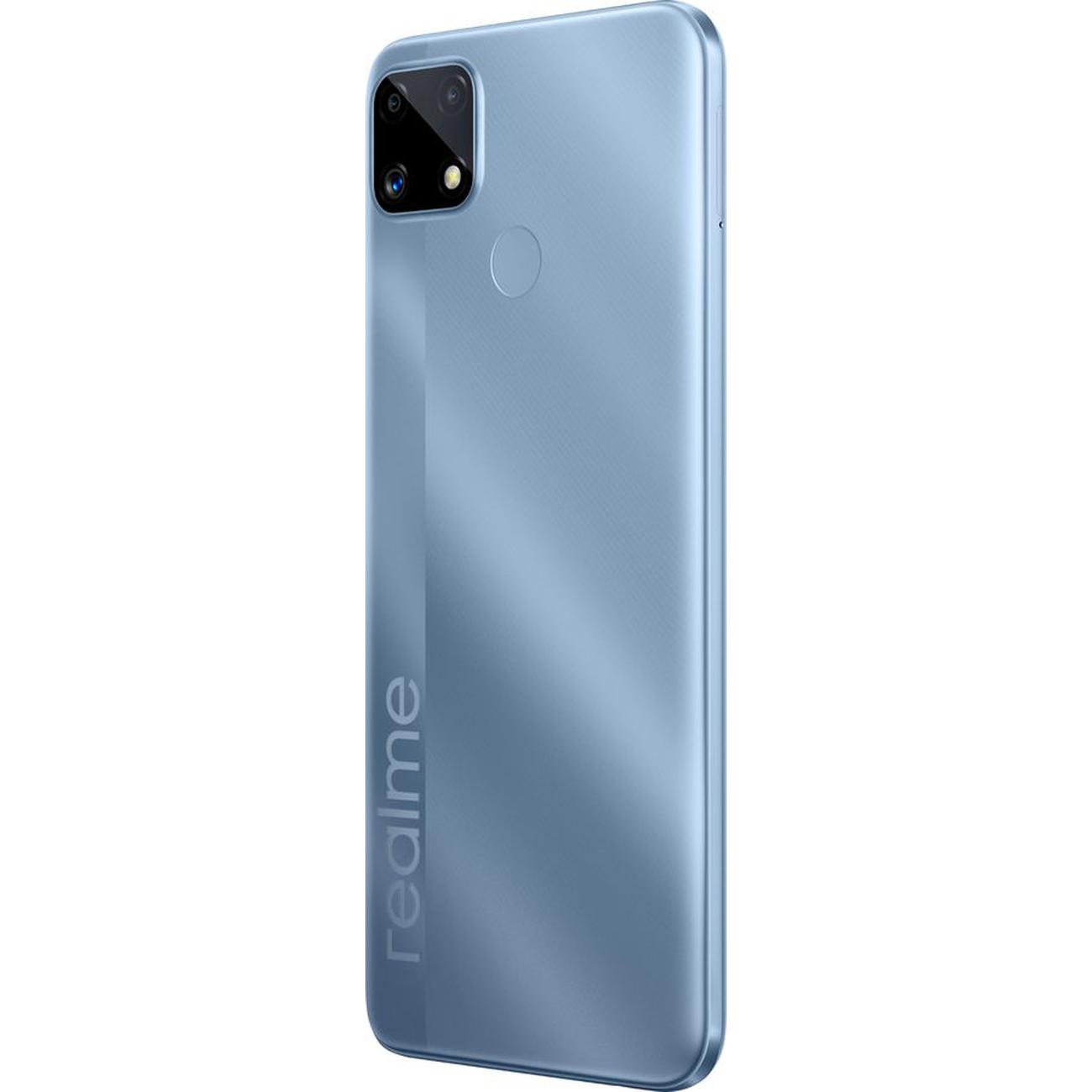 Смартфон Realme C25s в голубом цвете оснащен 4 Гб оперативной и 128 Гб встроенной памяти. Слот вмещает в себя две сим карты, есть отделение для карты памяти (возможность увеличить количество памяти до 256 Гб). Экран смартфона диагональю 6,5 дюйма обладает высоким процентом полезной площади — 88,7%. Пиковая яркость составляет 570 нит.
